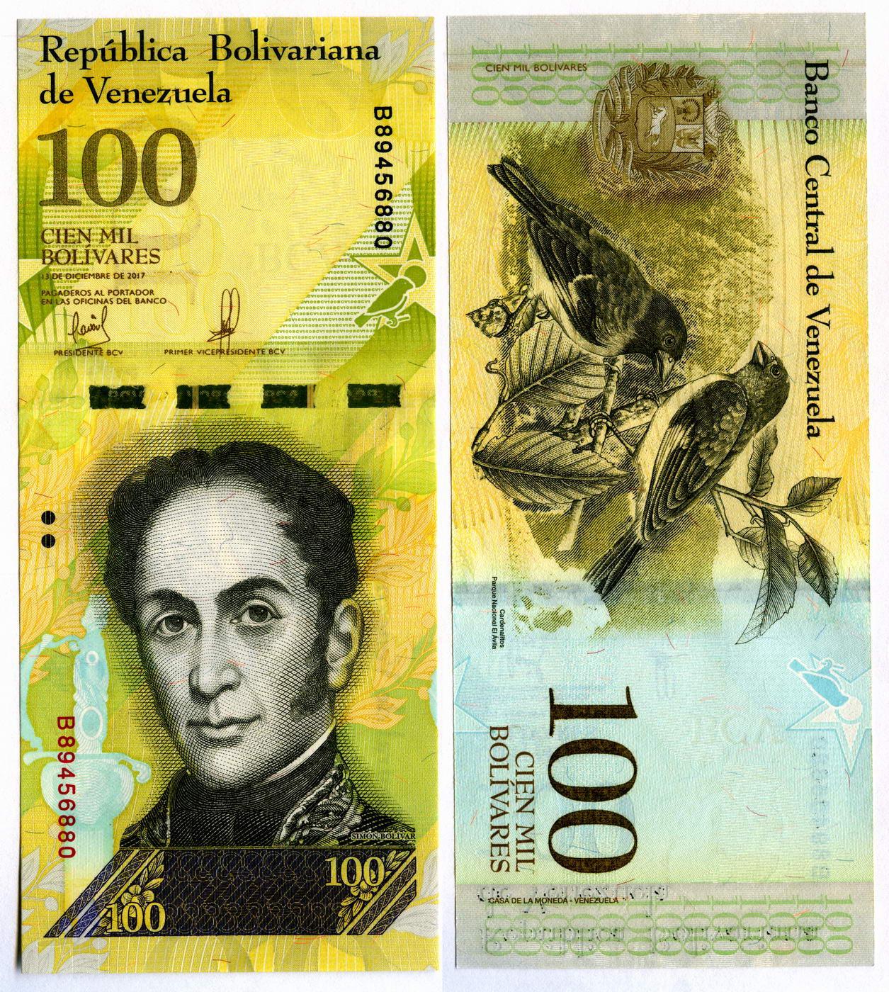 На 100 боливарах - Симон Боливар, освободитель значительной территории Южной Америки от испанского господства. Его именем названа страна Боливия, его имя в полном названии Боливарианской Республики Венесуэлы, где он считается главным национальным героем, и деньги, соответственно, тоже названы в его честь. Реверс: Огненный чиж, птица семейства вьюрковых, которых ежегодно тысячами отлавливали для продажи коллекционерам-любителям. Также на купюре гора Авила.