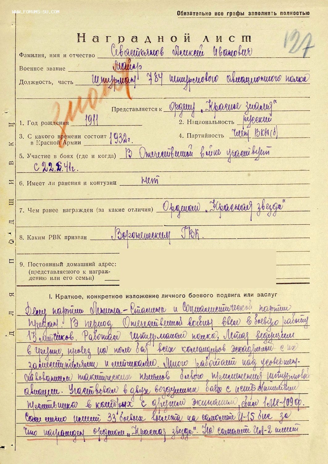 Кавалер Севастьянов Алексей Иванович 1911г.р.