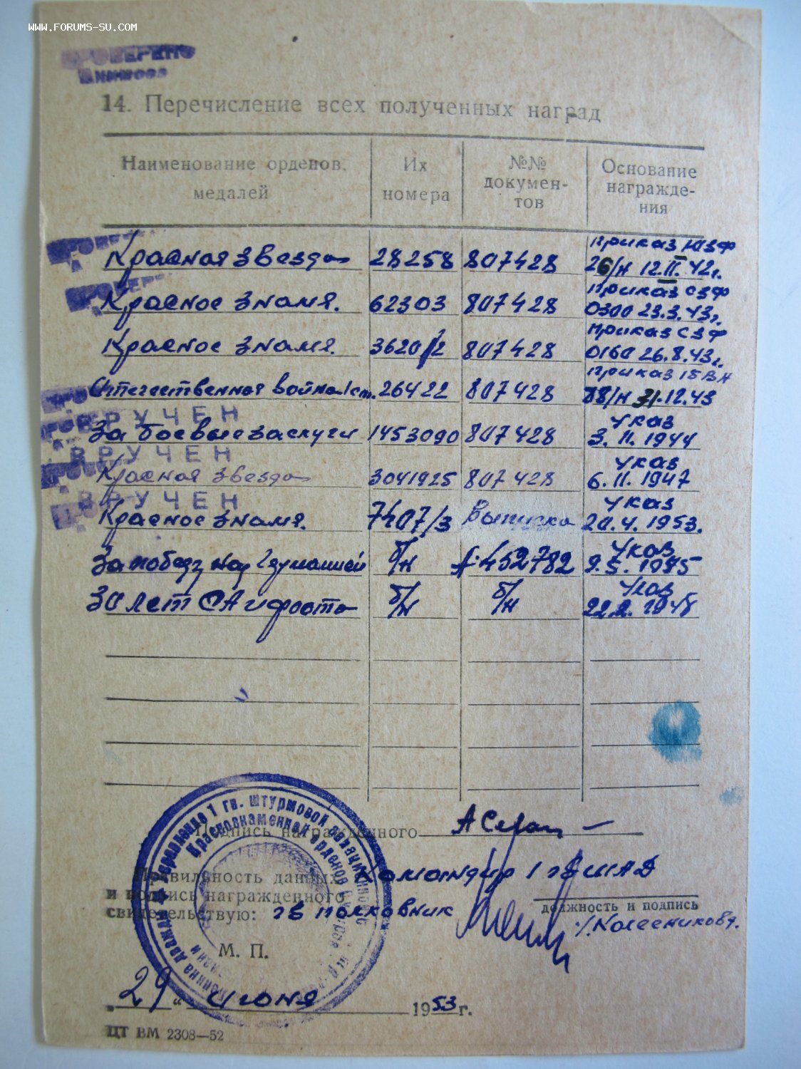 Учетно-послужная карточка с фото кавалера в подарок победителю.