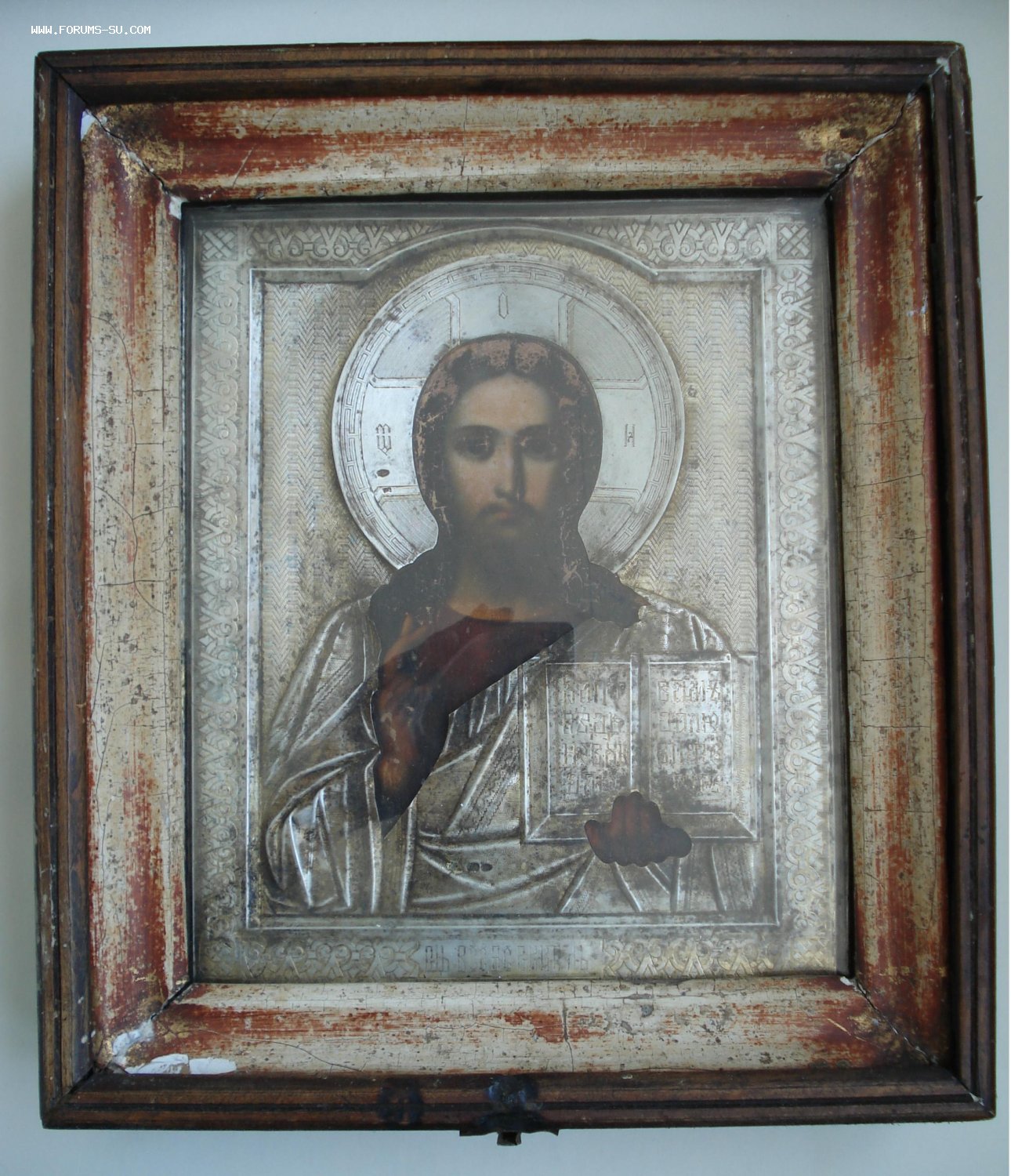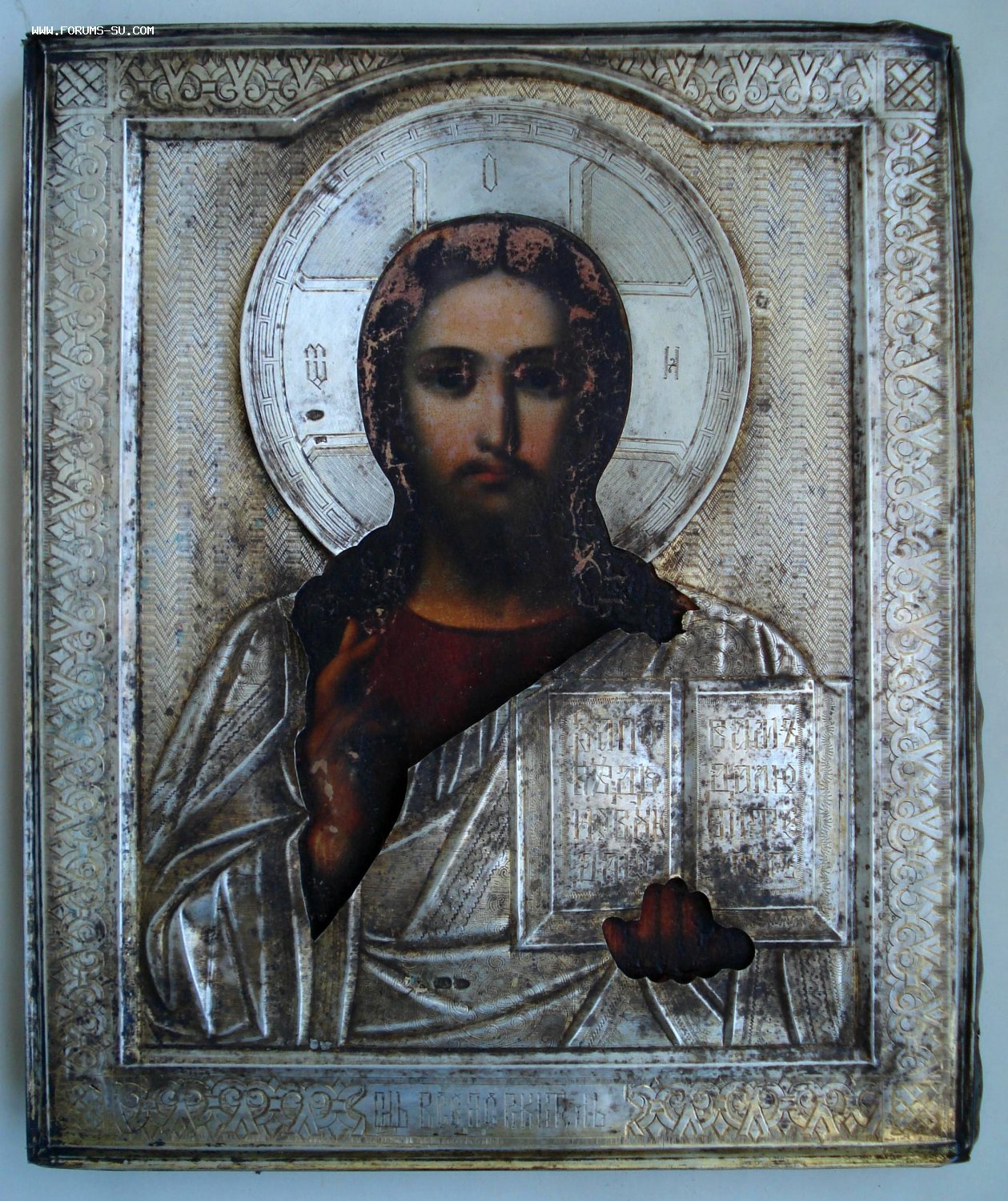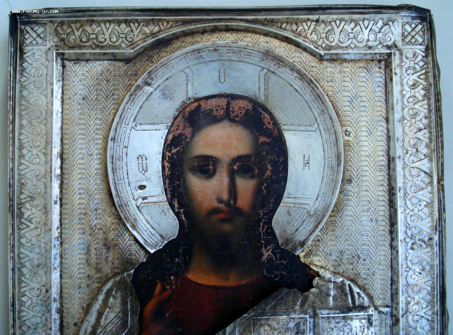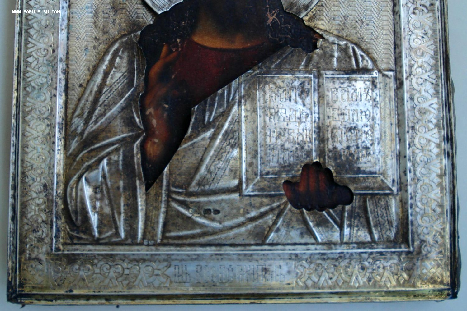 На серебряном окладе по центру есть надрыв на рубашке Спаса (на фото показал).