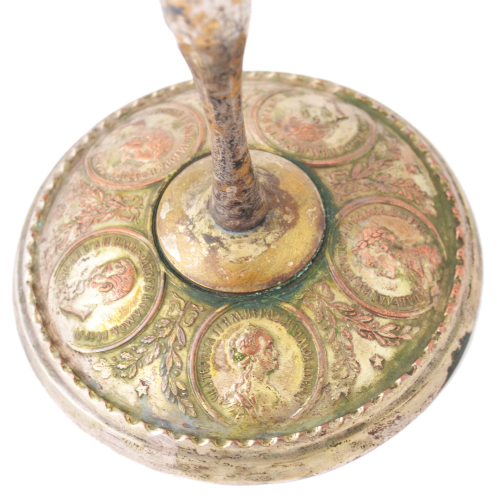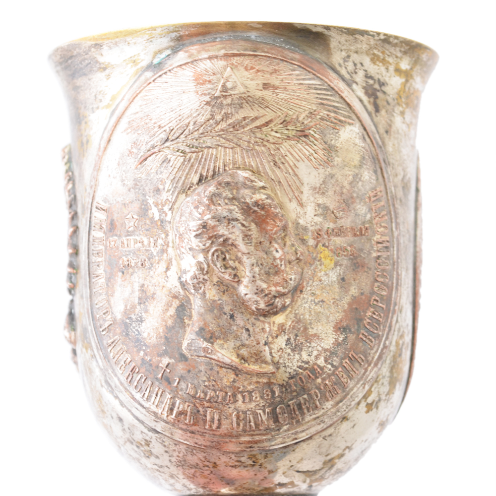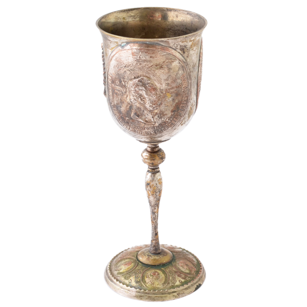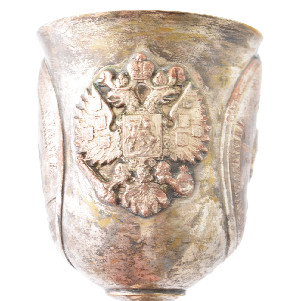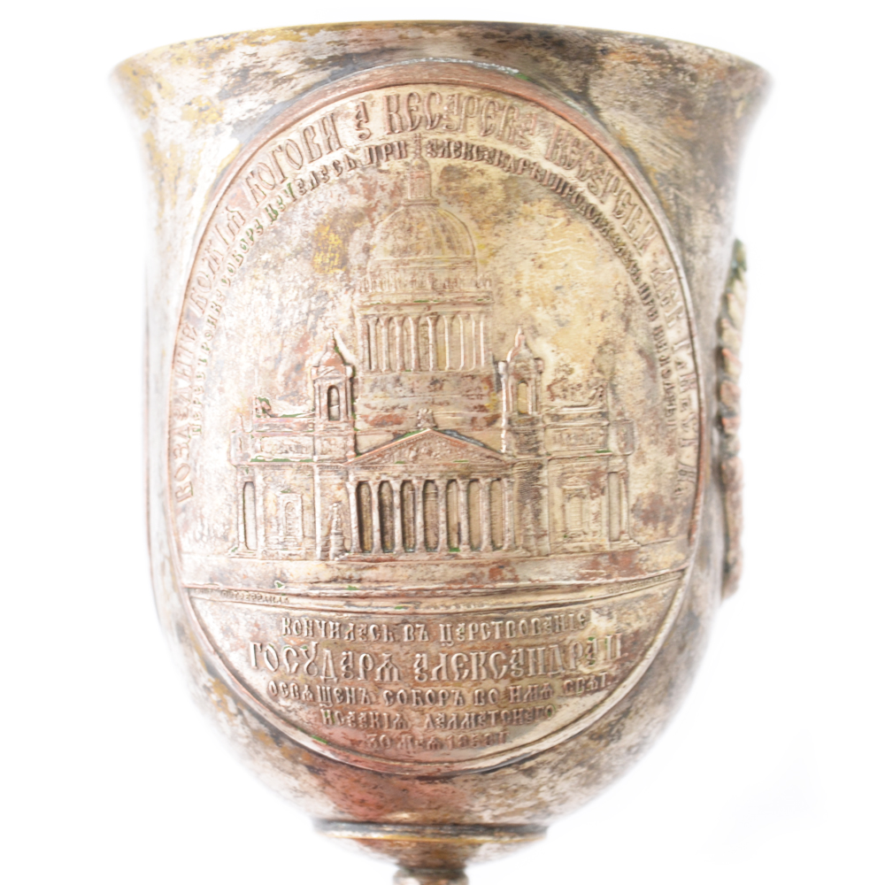 Достаточно редкий и интересный кубок, изготовленный из меди и покрытый серебрением. В центре декора чаши кубка помещен портрет императора Александра II, по сторона от которого размещен медальон с изображением Исакиевского собора СПб и российский герб. На основании кубка помещены медальоны с портретами Императоров династии Романовых. Высота кубка 205 мм. Сохранность хорошая, утраты серебряного покрытия по периметру (при желании нового владельца, покрытие мы можем помочь восстановить). Гарантия подлинности. Кубок с таким сюжетом встречен нами впервые.