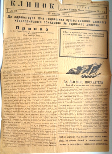 Газета Клинок орган ячейки ВКПБ кавалерийского эскадрона 1 Й Туркменской горно стрелковой дивизии 1932г