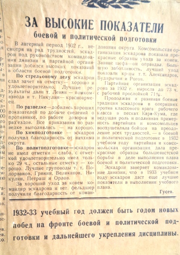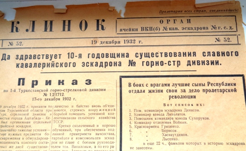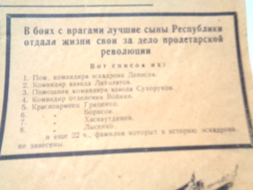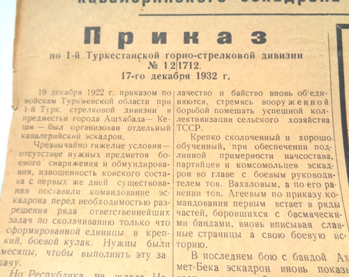 В газете опубликован приказ по дивизии о боевом пути эскадрона,о боях с басмачами.