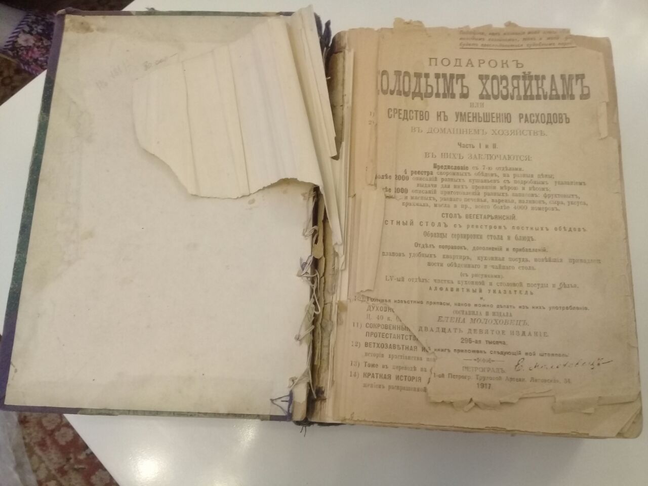 Подарок молодым хозяйкам, или Средство к уменьшению расходов в домашнем хозяйстве. Редкое двадцать девятое (в год революции) издание, прижизненное. Автограф Е. Молоховец сохранён. Переплёт обычный, местами сшит нитками. Состояние среднее, книга использовалась, на некоторых страницах есть записи и пометки, все страницы сохранены, некоторые замяты. Петроград, 1917 год издания.