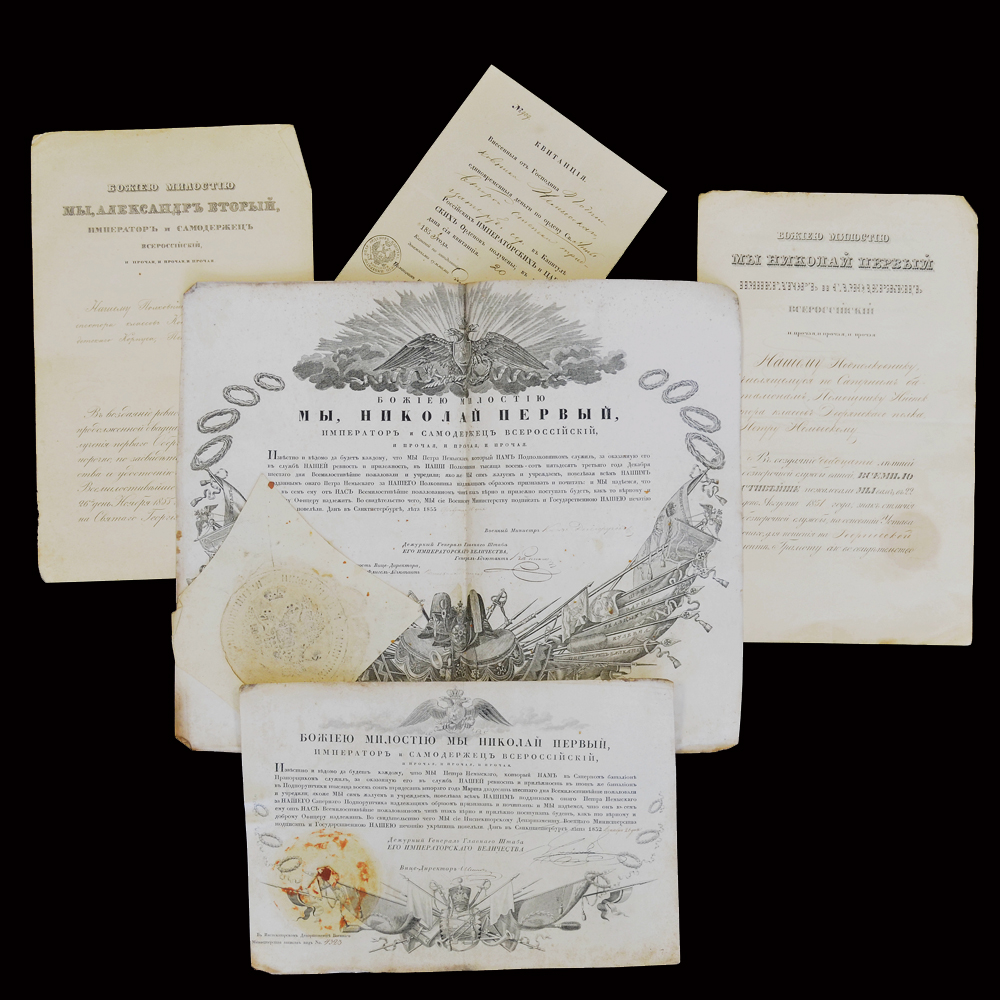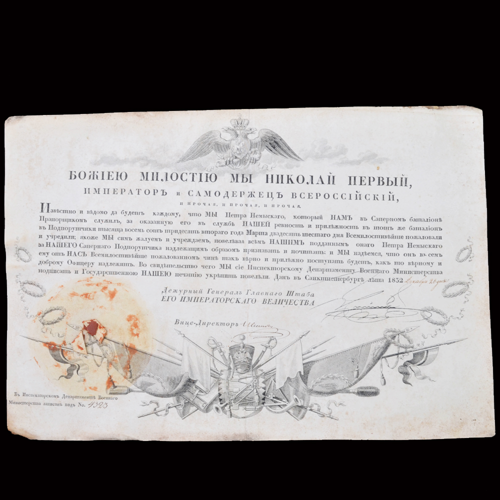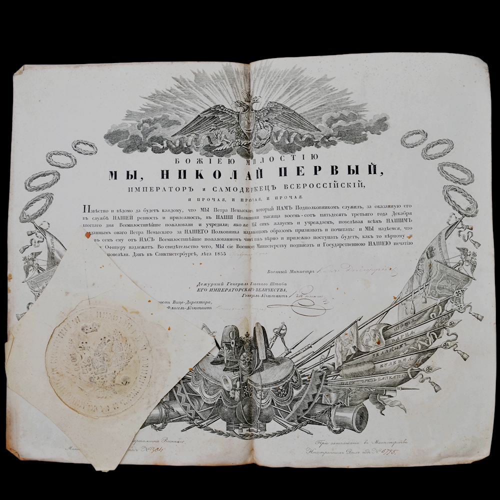 Описание: Достаточно редкий лот документов, принадлежавших будущему генералу российской армии Петру Фортунатовичу Немыскому. Военную службу начинал прапорщиком в саперном батальоне. 26.12.1832 произведен в подпоручики со старшинством с 26.03.1832. 10.02.1855 произведен в полковники со старшинством с 06.12.1853. На 1855 г. – помощник инспектора классов Константиновского кадетского корпуса, кавалер ордена Св. Анны 4-й ст. с надписью «За храбрость», знака отличия за 20 лет беспорочной службы (1851), ордена Св. Анны 2-й ст. (1853). 26.11.1855 (в день праздника ордена Св. Георгия) награжден орденом Св. Георгия 4-й ст. за 25 лет беспорочной службы в офицерских чинах. 25.10.1861 произведен в генерал-майоры. В списке генералам по старшинству 1862 г. не значится (вероятно, вышел в отставку). Лот включает в себя несколько документов: