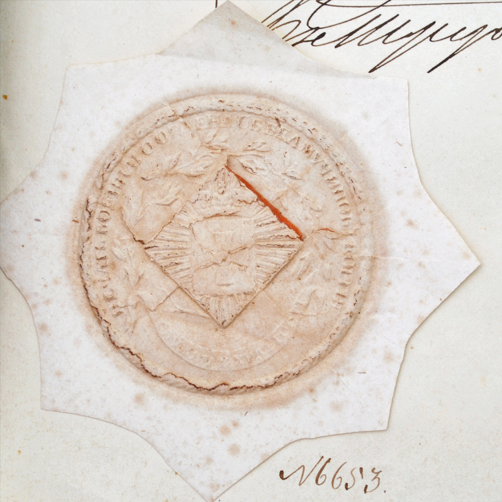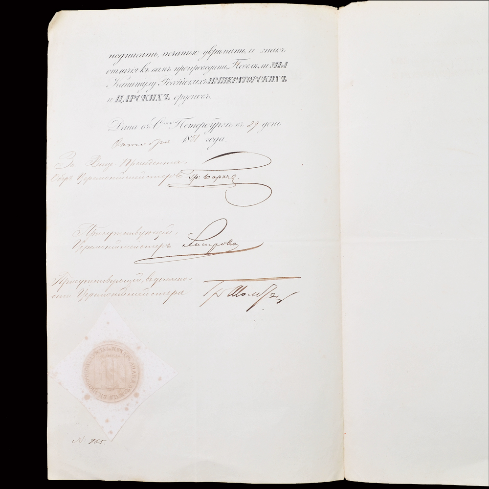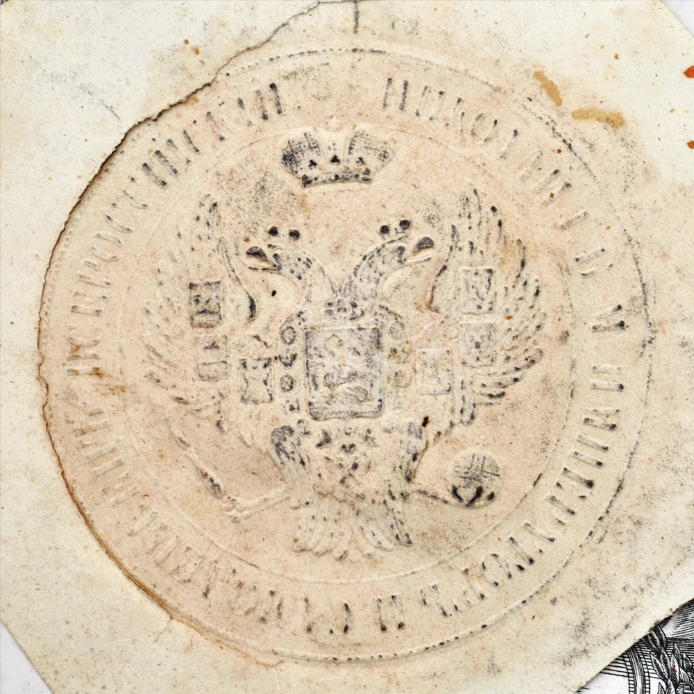 2. Наградной документ на знак отличия за 25 лет беспорочной службы на Георгиевской ленте, выданный 22 августа 1851 года полковнику по саперным батальонам помощнику инспектора классов Дворянского полка Немыскому. C оттиском печати знака отличия за беспорочную службу.