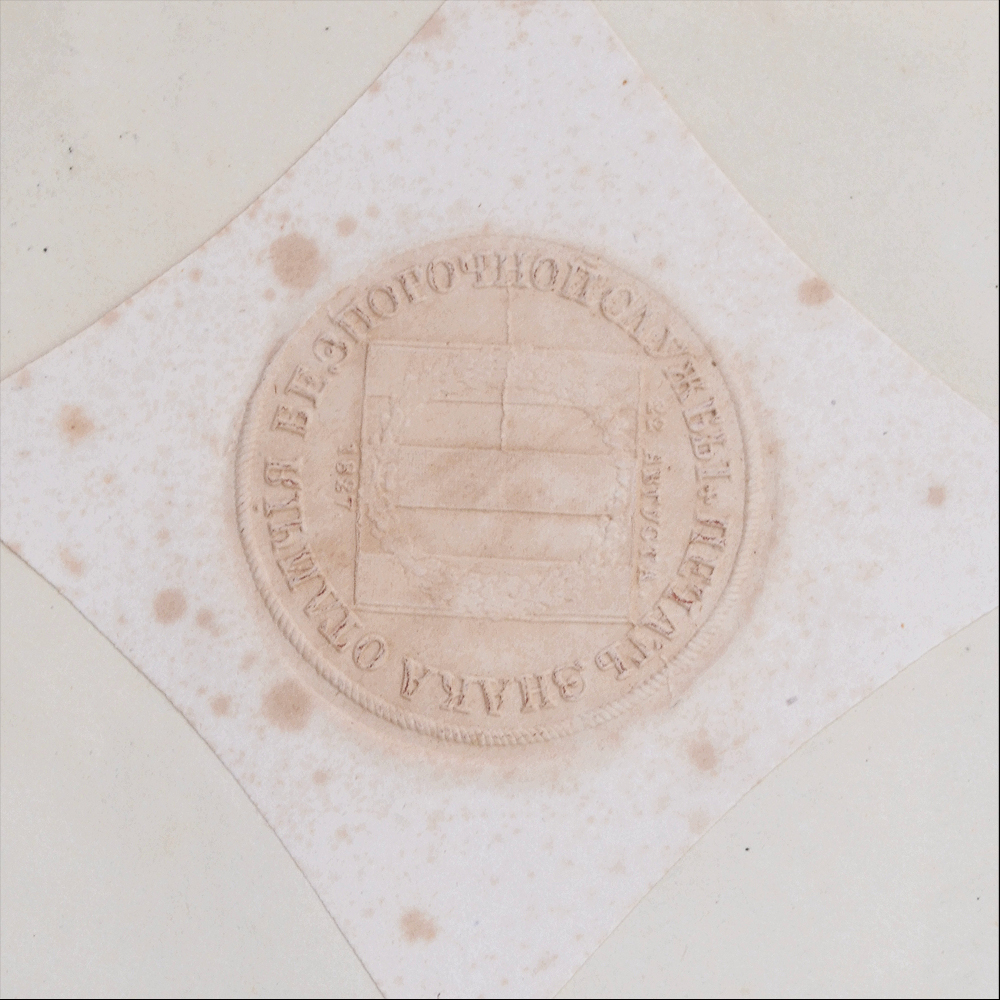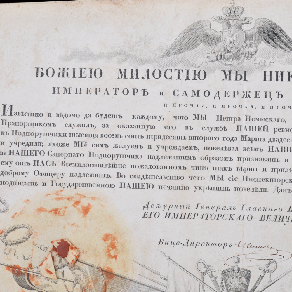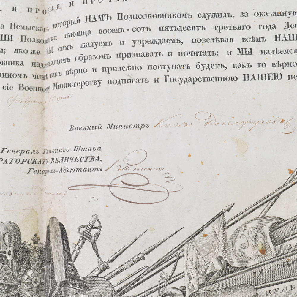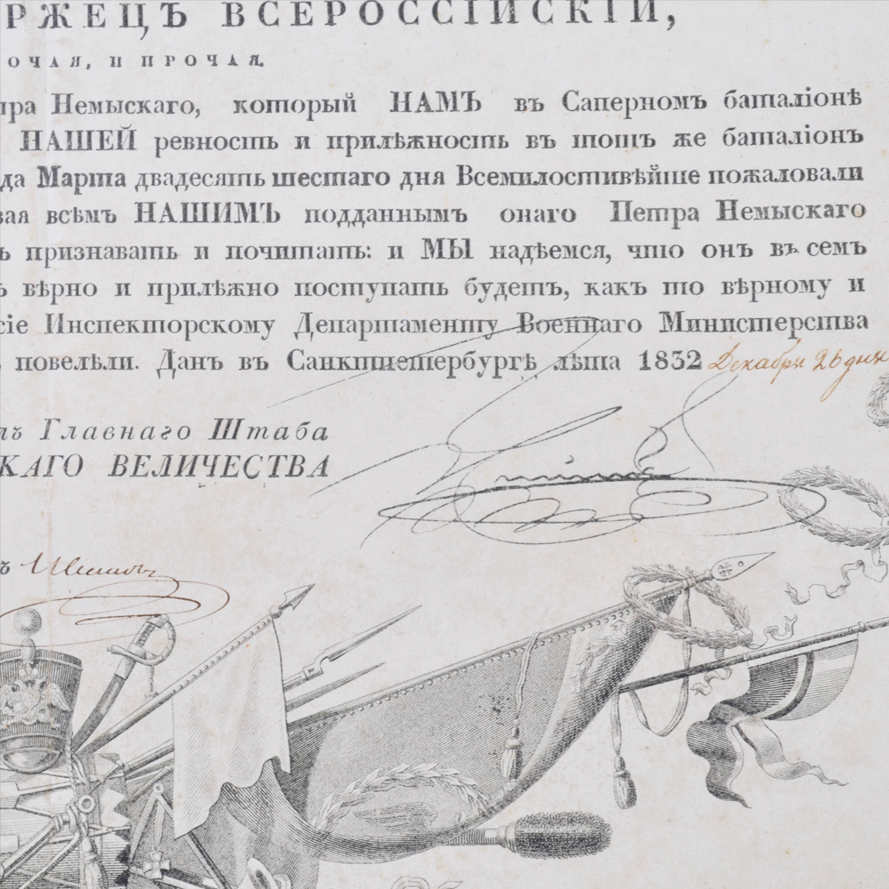 1. Свидетельство о присвоении чина подпоручика П. Немыскому, выданное 26 декабря 1832 года с подписью П.А. Клейнмихеля (факсимиле). Размер 23*34 мм. Утрата бумажного оттиска печати. Граф (с 1839) Пётр Андреевич Клейнмихель (11 декабря (30 ноября) 1793 — 3 февраля 1869) — российский государственный деятель из немецкого рода Клейнмихелей, протеже Аракчеева и беспрекословный исполнитель воли Николая I. В 1842—1855 годах — главноуправляющий путей сообщения и публичных зданий. Курировал строительство Николаевской железной дороги.