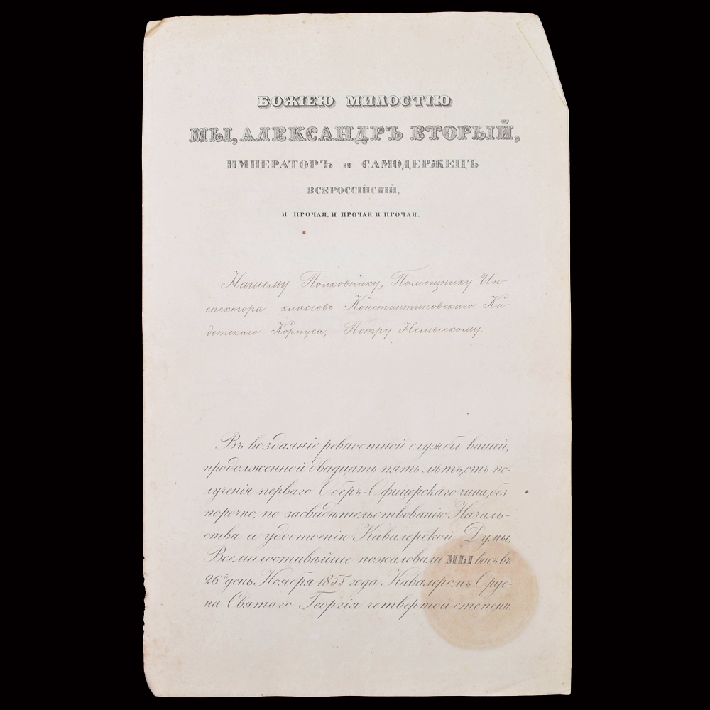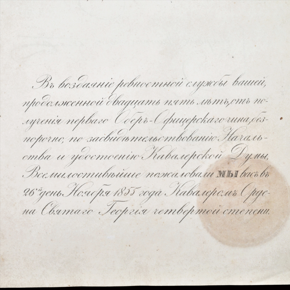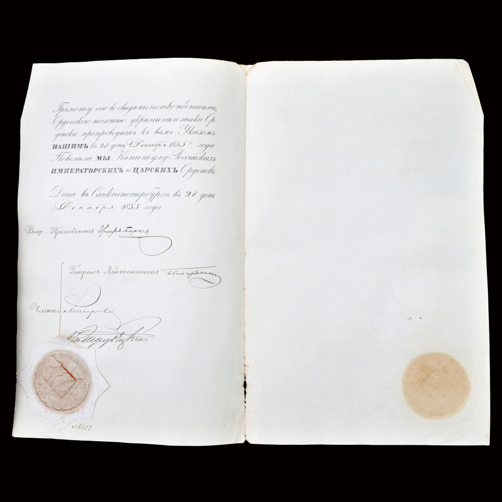 4. Наградной документ на знак Ордена Св. Георгия 4 степени, выданный 28 декабря 1855 года полковнику помощнику инспектора классов Константиновского кадетского корпуса Немыскому). C оттиском печати Ордена Св. Георгия.