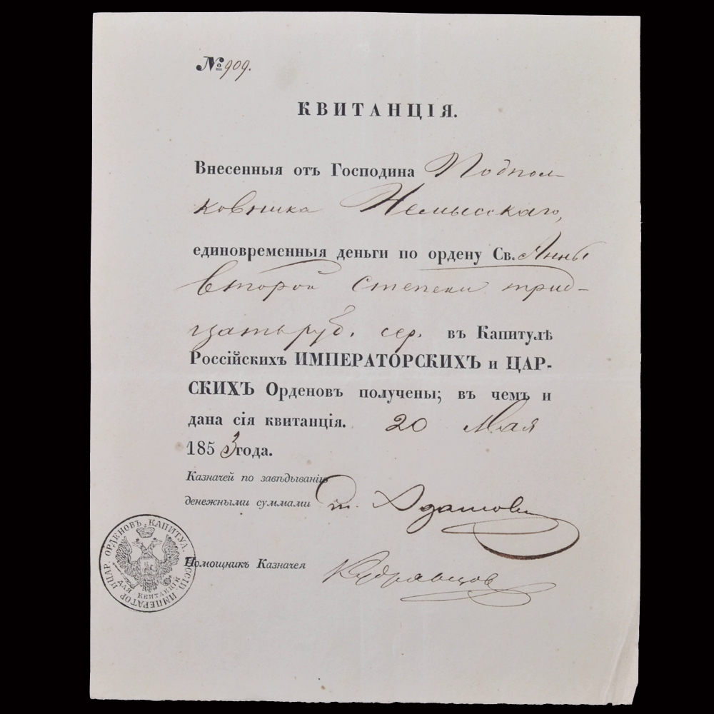 3. Квитанция от полковника Немыского о получении денег по ордену Св. Анны 2 степени в Капитул российских орденов, выданная 20 мая 1853 года.