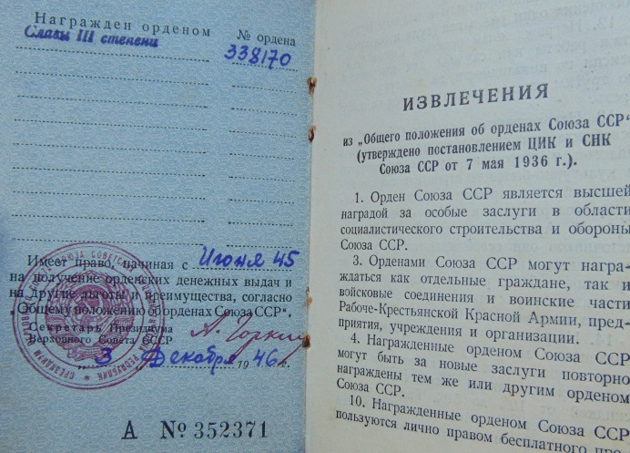 2.Орденская книжка к Слава 3 ст.№338170;