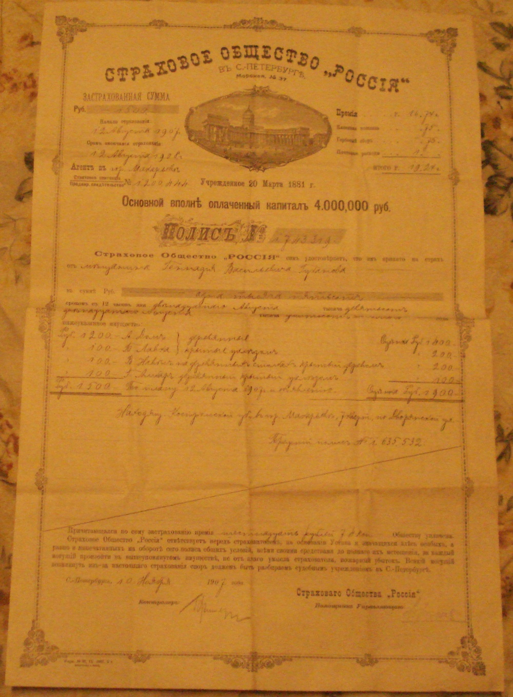страховой полис общества "РОССИЯ" 1907 г. unker7 - 28 ноя 2018 20:38.42 × Мини профиль пользователя unker7 Сообщения: 2658 Зарегистрирован: 09 май 2005 21:44.35 Откуда: Россия Статус: Не в сети - 28 ноя 2018 20:38.42 #6230234 все на фото... большого размера 31 х 47 см.предложите... Фото отправку оплачивает покупатель.