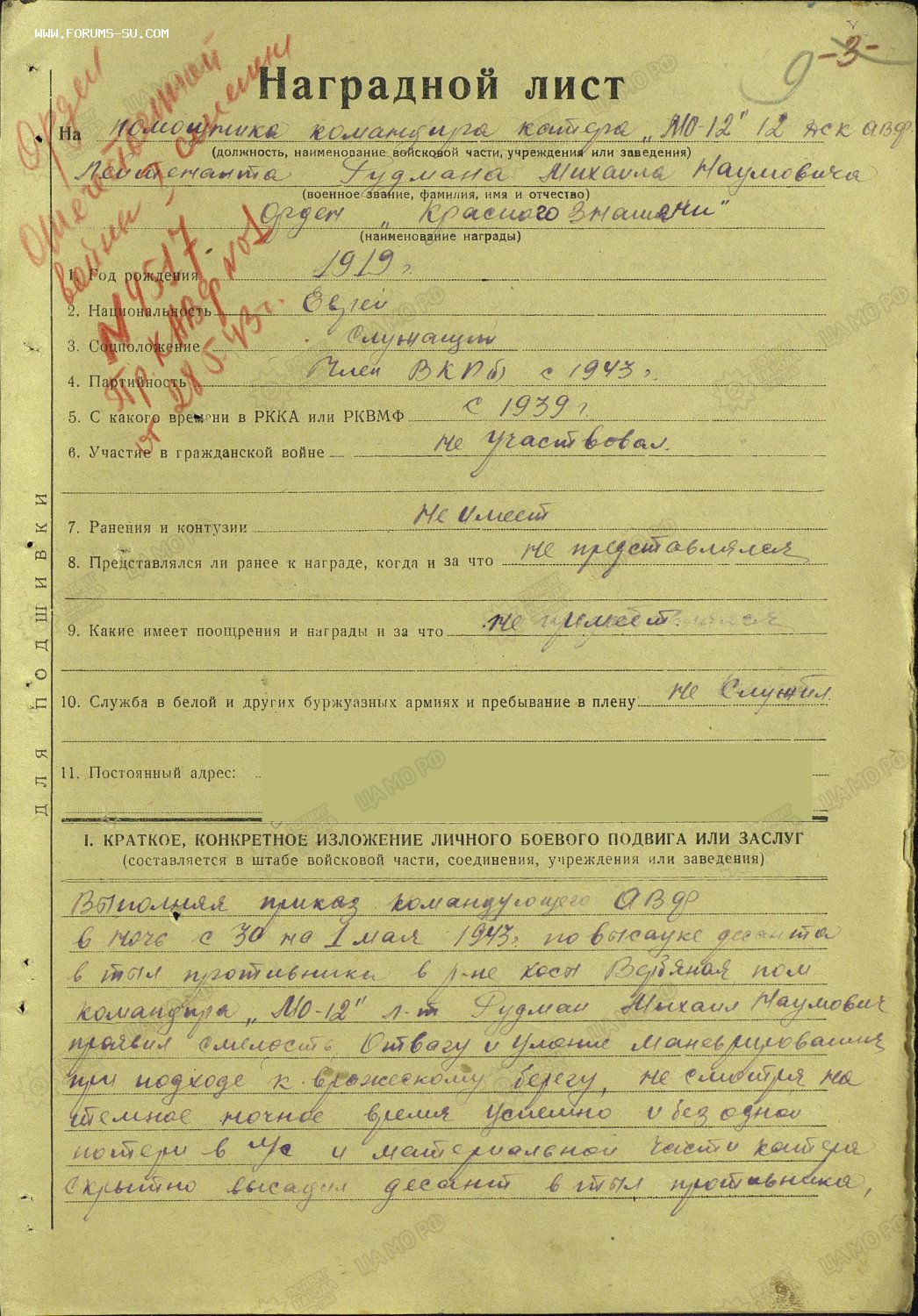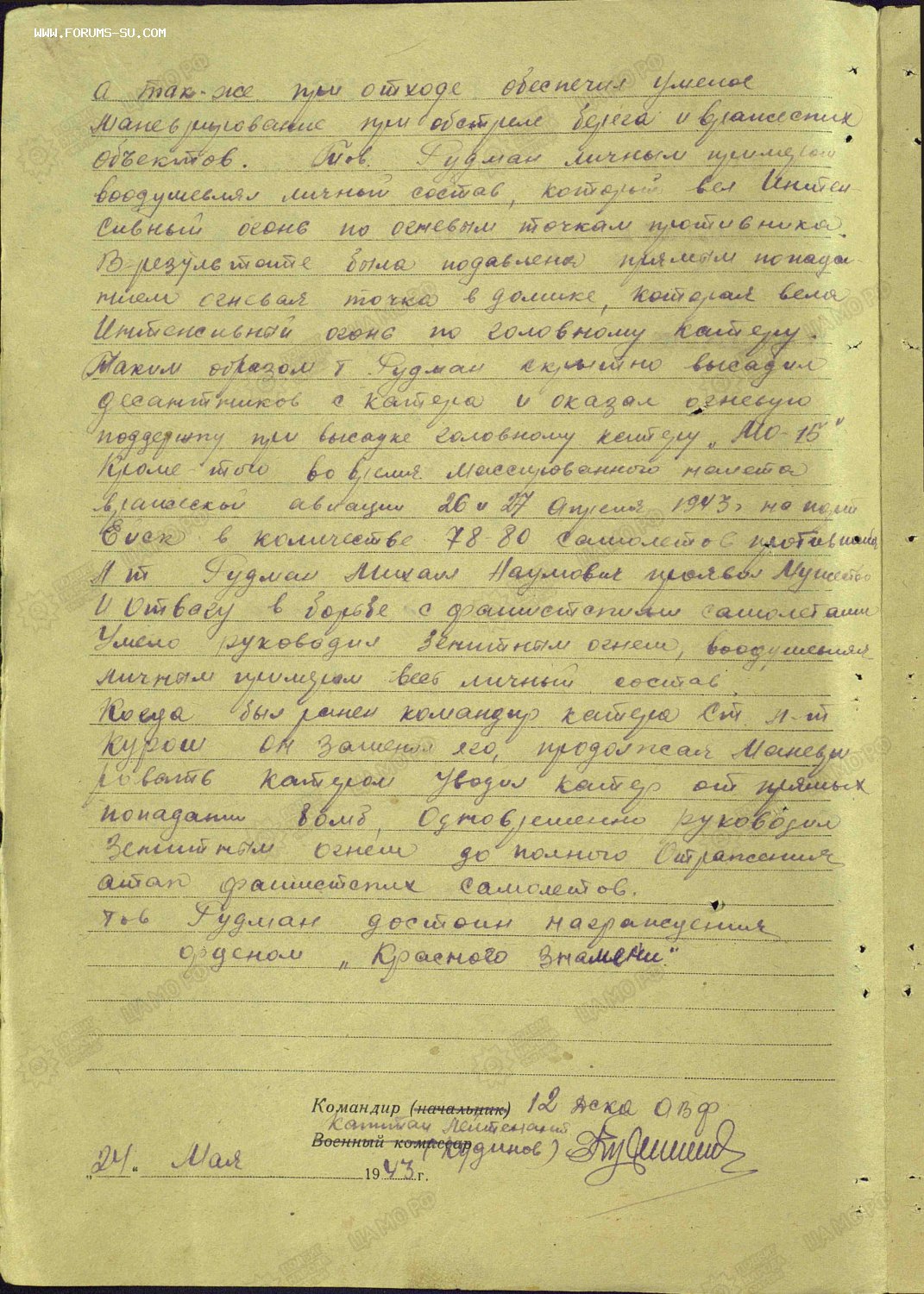 При высадке десанта в ночь с 9 на 10.09.43. катер лейтенанта Рудман идя головным, придя в заданную точку и в минимальный срок высадил десант. Умело управляя манёврами катера, личный боевой пример мужества и отваги обеспечили выполнение боевого приказа. Лейтенант Рудман является участником операции по высадке десанта заподнее гор. ---п-ико.
