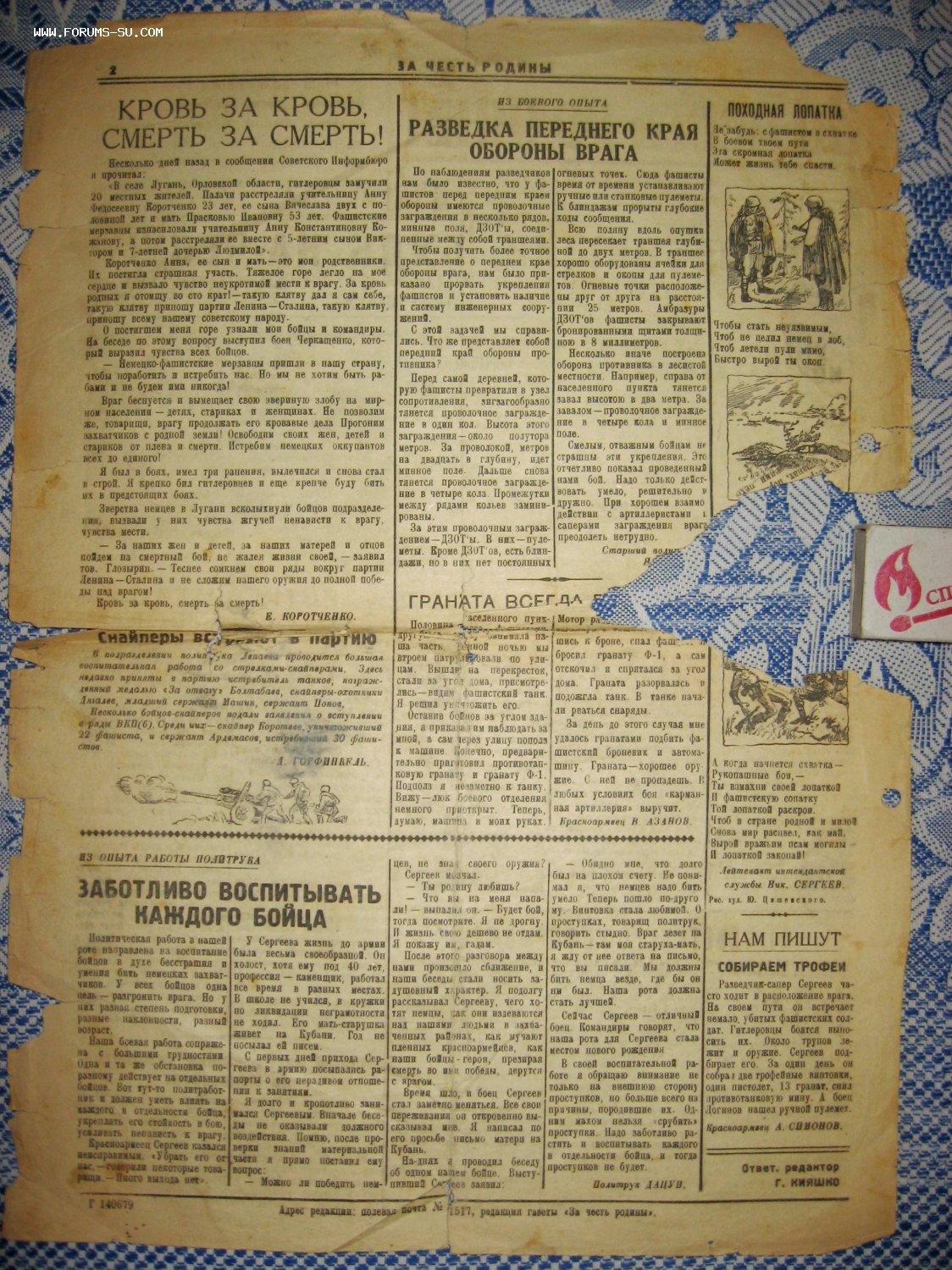 - Подлинный выпуск полевой красноармейской газеты 20-й армии Западного фронта "За честь Родины" периода Битвы за Ржев (Великая Отечественная война). Выпуск содержит множество статей + творчество красноармейцев, двусторонняя. Прошла всю войну.