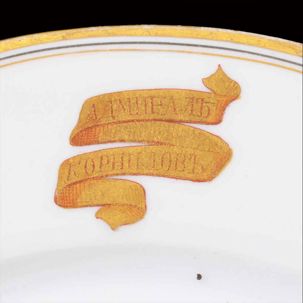 В рамках судостроительной программы 1880-х гг. на французской верфи в Сен-Назере 31 октября 1885 г. был заложен бронепалубный крейсер 1-го ранга «Адмирал Корнилов», проект которого имел немало общего с французскими крейсерами типа Cecille. Корабль водоизмещением 5880 т отличался высокой по тем временам скоростью и солидным вооружением. Экипаж по штату состоял из 481 матроса и офицера. Крейсер поставлялся полностью комплектным (за исключением личного оружия экипажа), так что вся посуда и кухонная утварь были также французского происхождения. Не стала исключением и данная тарелка.