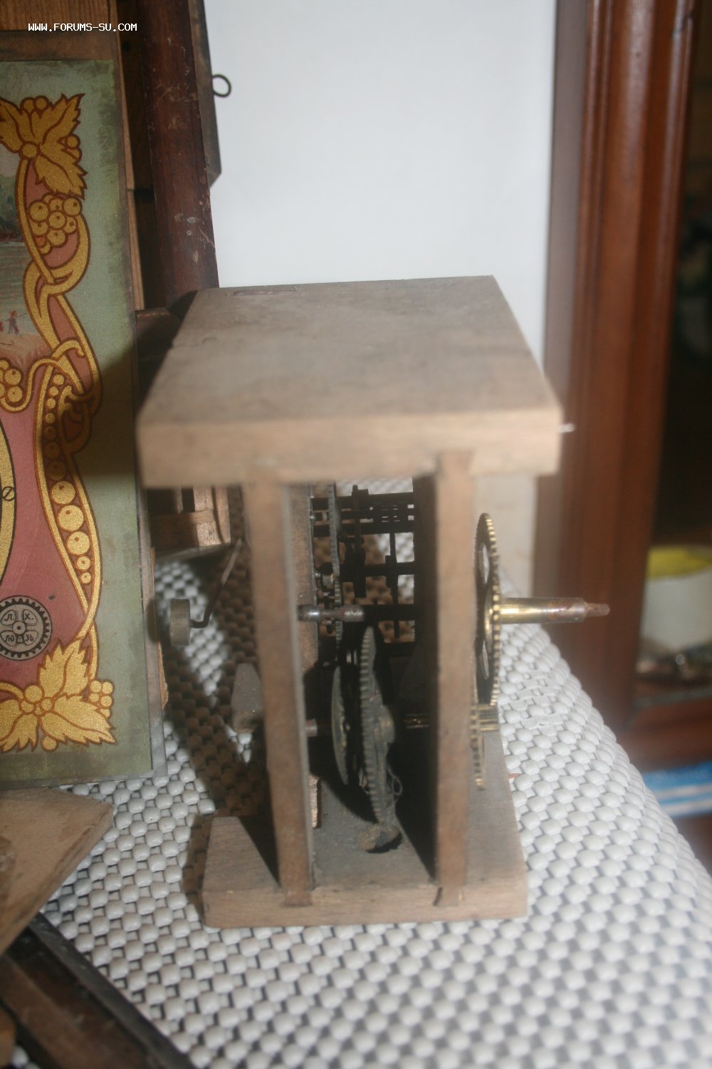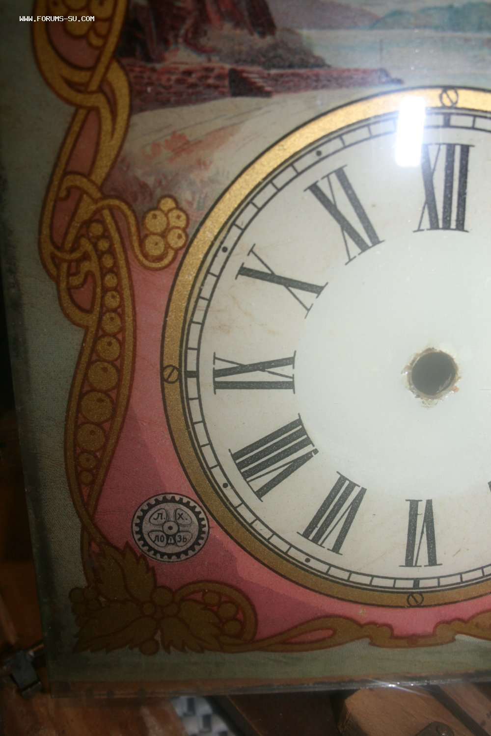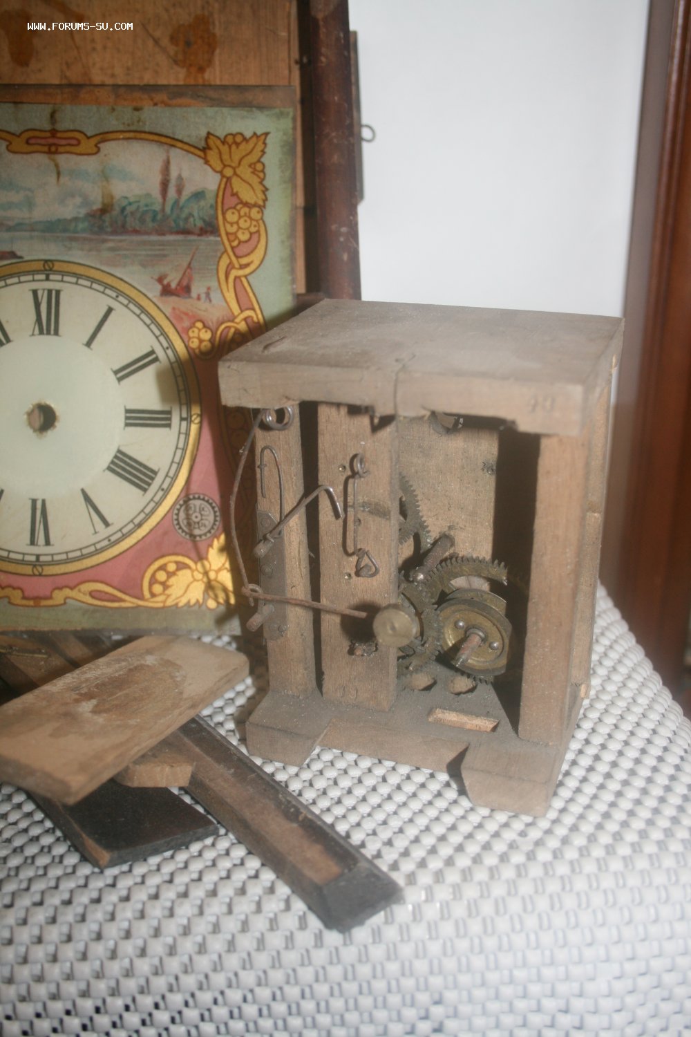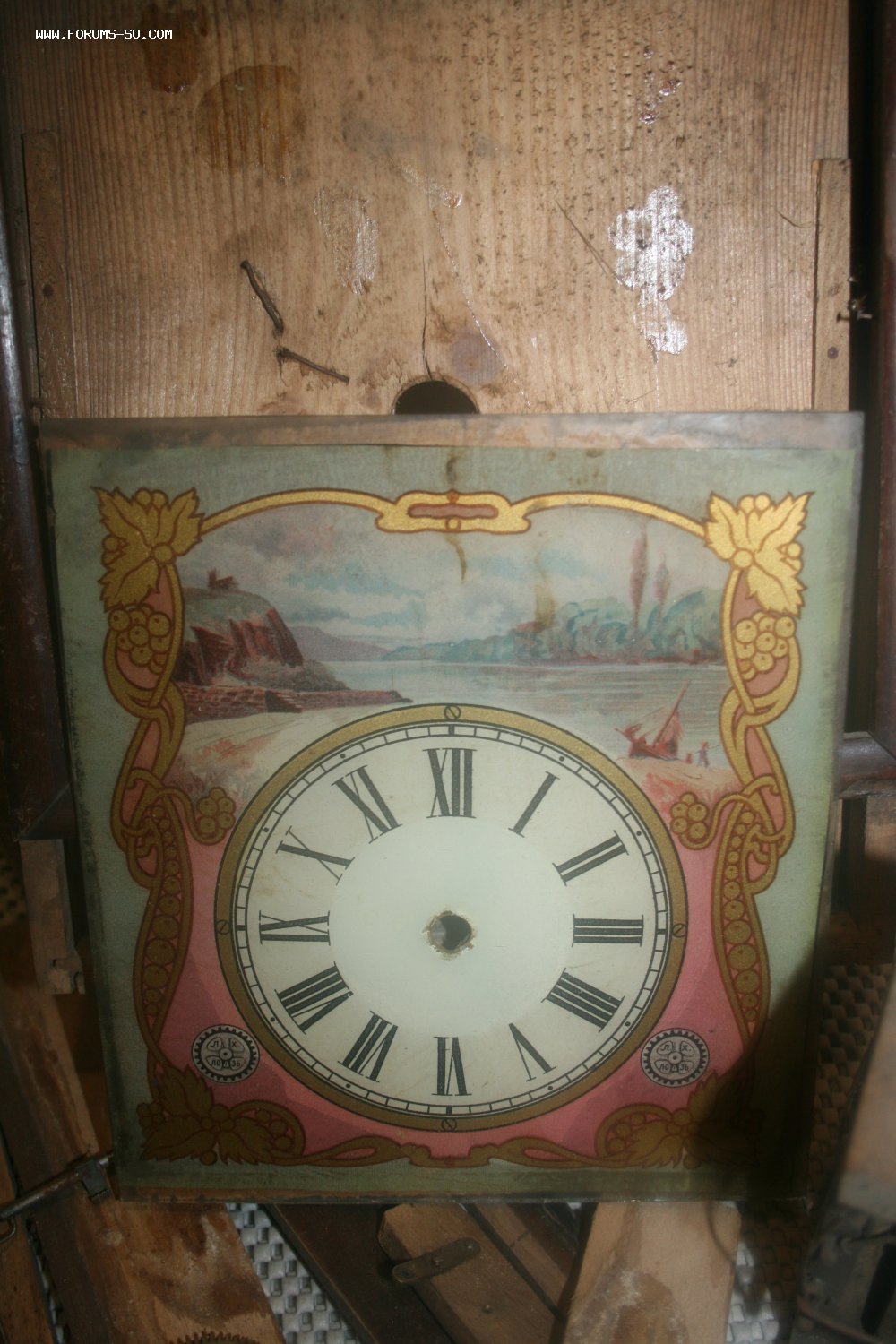 Деревянный корпус, механизм на деревянных платах, циферблат - роспись (под стеклом).