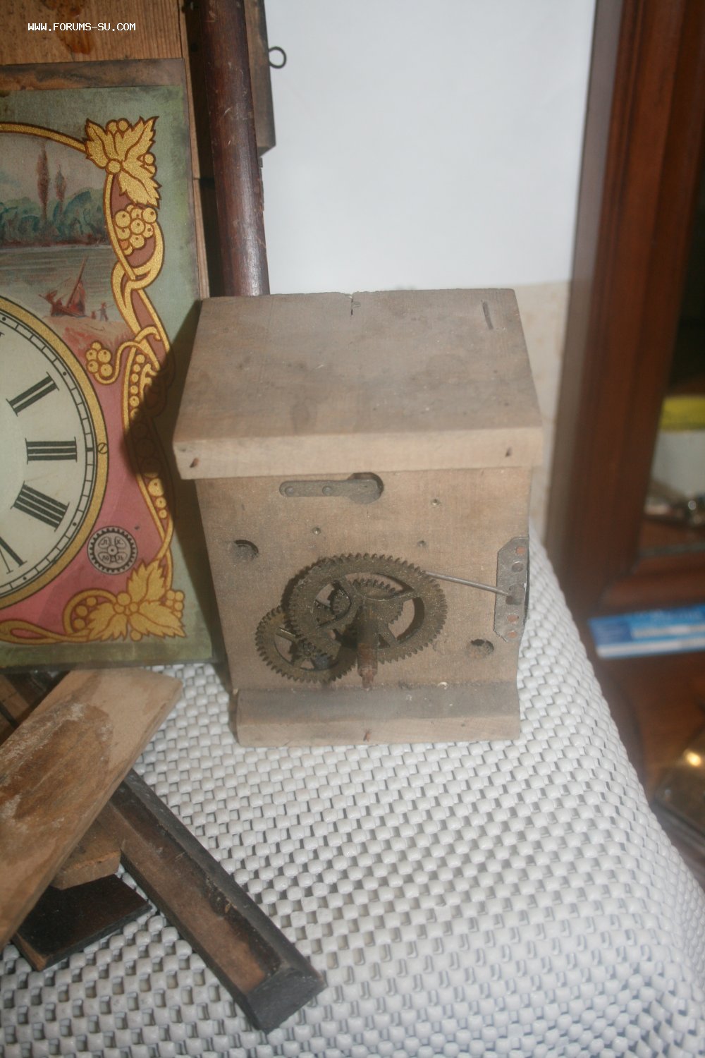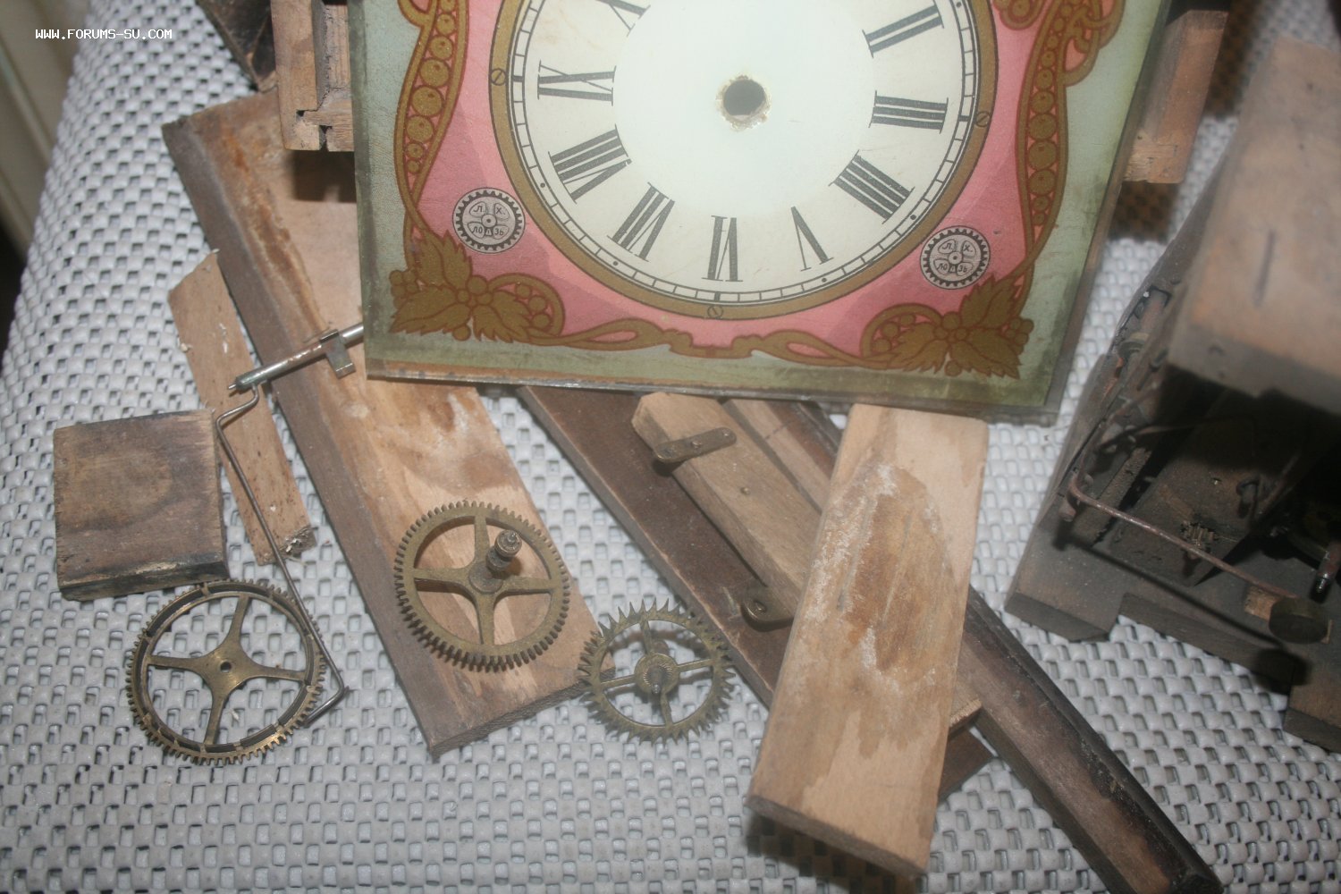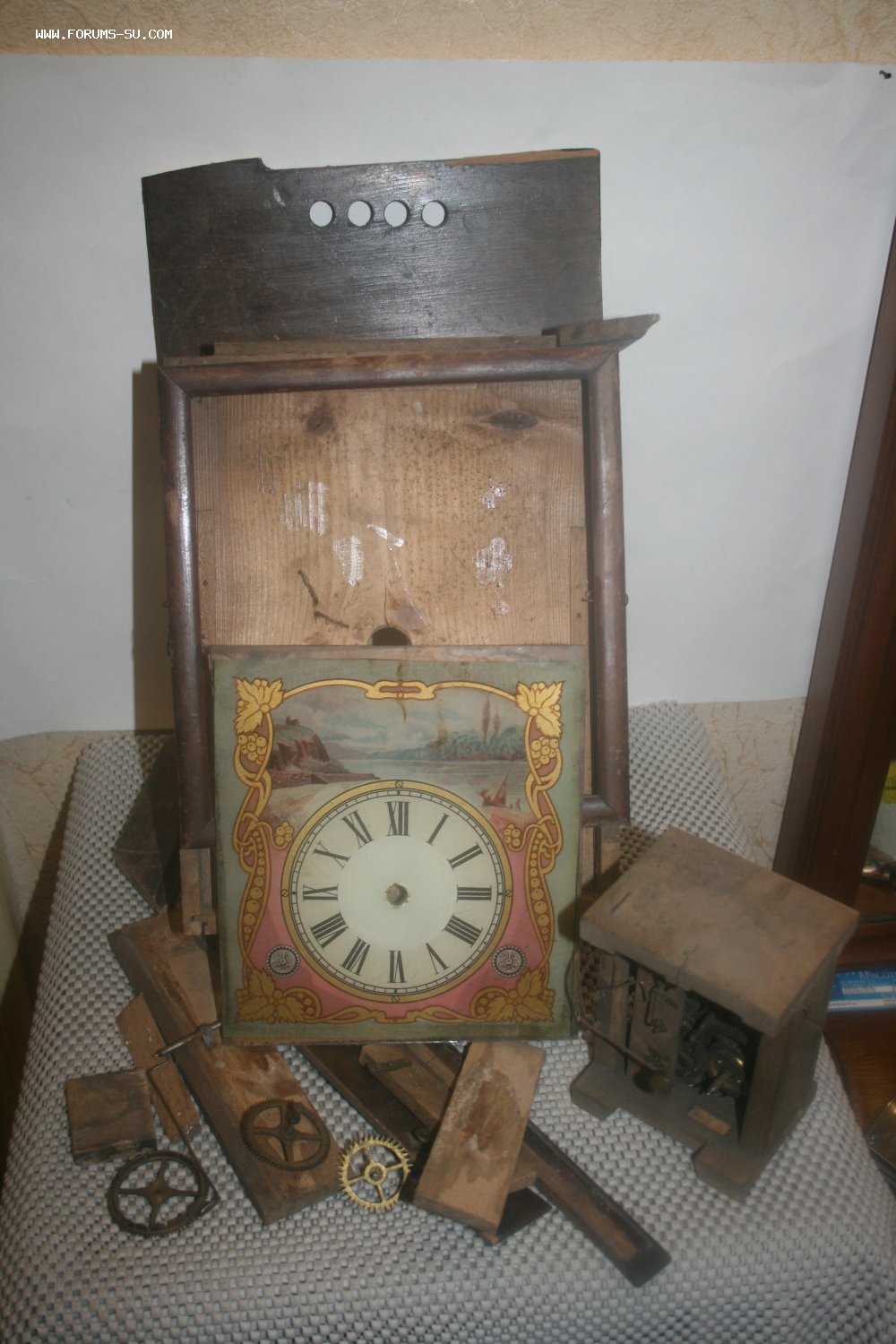 Деревянный корпус, механизм на деревянных платах, циферблат - роспись (под стеклом).