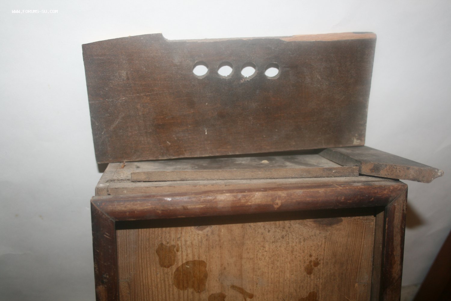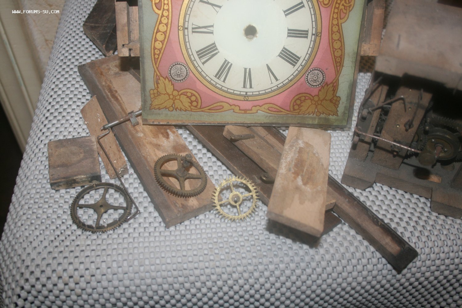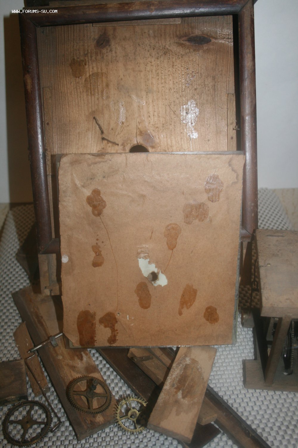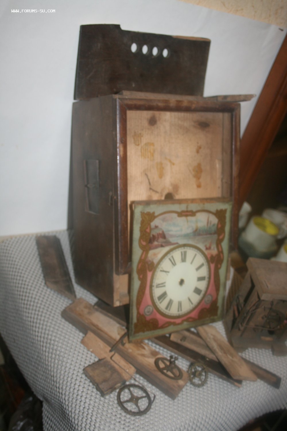 Деревянный корпус, механизм на деревянных платах, циферблат - роспись (под стеклом).