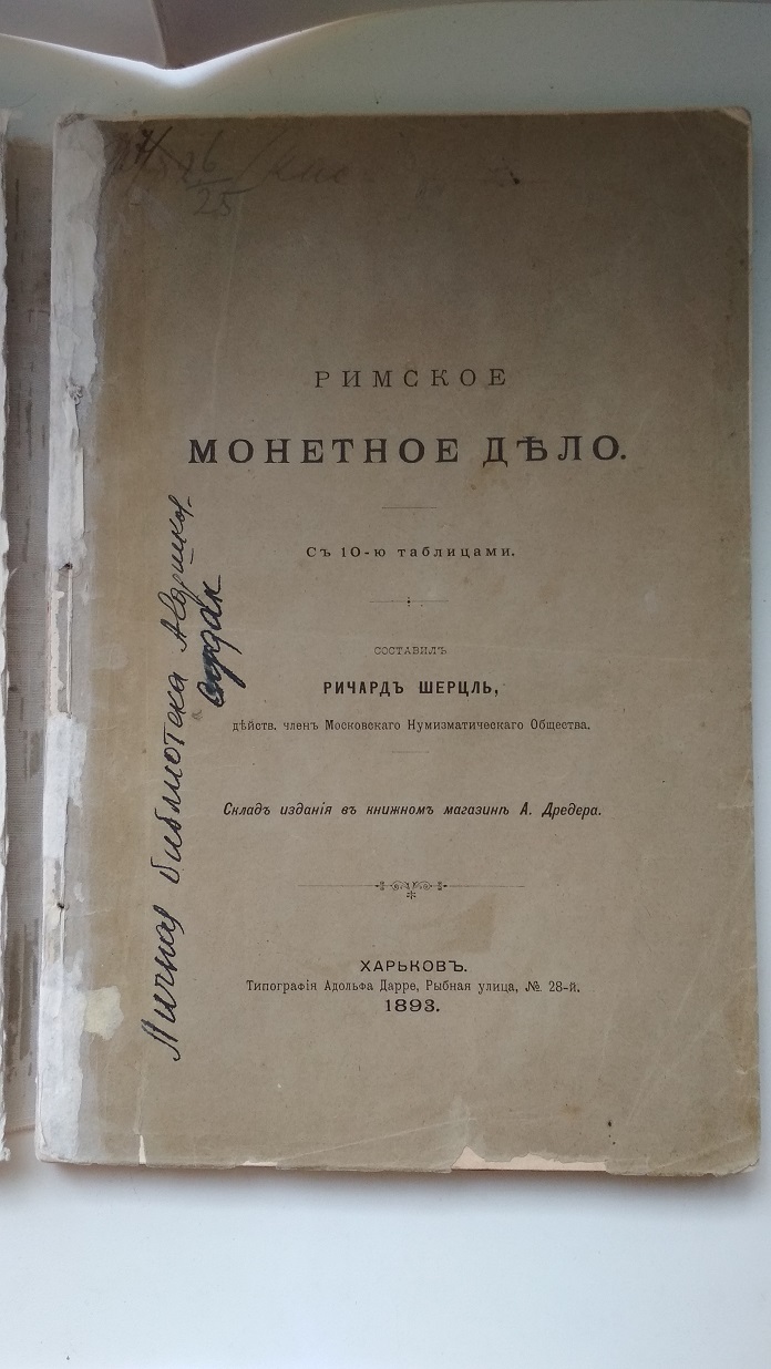 Шерцль Ричард. Римское монетное дело. Харьков тип. А. Дарре 1893г. VIII + 210 с.+ 10 л.ил. (илл.отсутствуют). Сохранена изд. шрифтовая обложка. С автографом автора.,