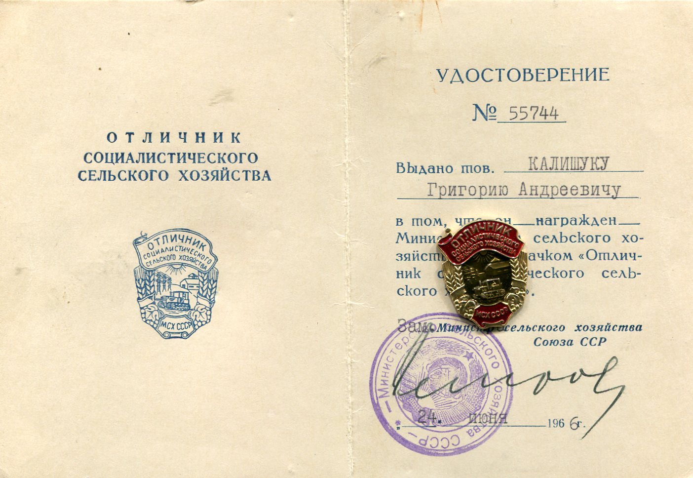 Знак. Отличник Социалистического сельского хозяйства МСХ СССР. с документом.