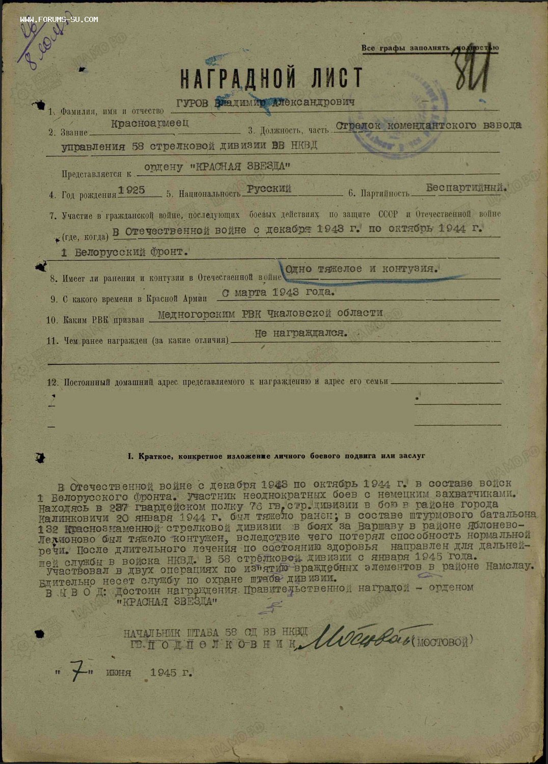 Звезда 3747486 Гуров Владимир Александрович 1925 г. р. 1 Укр. фр. 140 от 19.09.45 г[/i]