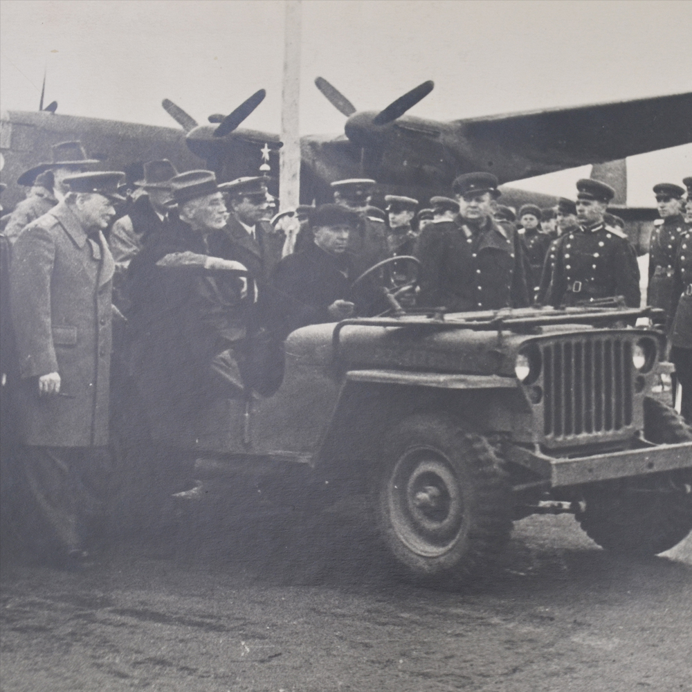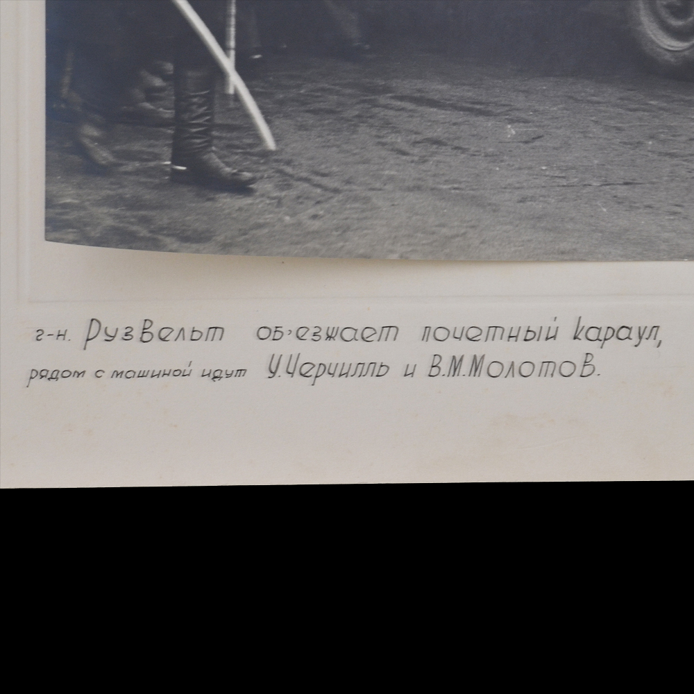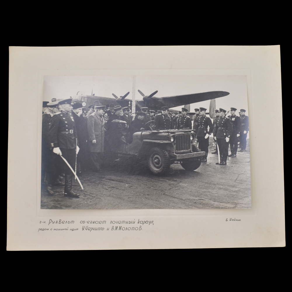 Описание: Оригинальная и очень редкая фотография, сделанная во время пребывания делегация Великобритании и США в Ялте в феврале 1945 года знаменитым советским фотографом Б. Шейниным, чьи снимки вошли в золотой фонд советской фотографии. На оригинальном паспарту эпохи. На фото изображены английский премьер-министр Уинстон Черчилль, американский президент Франклин Рузвельт (в машине) и министр иностранных дел СССР В. Молотов. Размер с паспарту 290*400 мм, размер самого фото 190*290 мм. Очень редкий снимок, относящийся напрямую к одному из самых знаковых событий дипломатии в годы Второй Мировой войны. Гарантия подлинности.