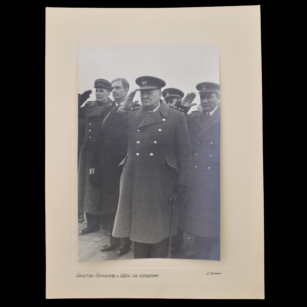 Описание: Оригинальная фотография, сделанная во время пребывания делегация Великобритании и США в Ялте в феврале 1945 года советским фотографом И. Хряпкиным. На оригинальном паспарту эпохи. На фото изображены министр иностранных дел Великобритании А. Иден и английский премьер-министр Уинстон Черчилль. Размер с паспарту 290*400 мм, размер самого фото 190*290 мм. Очень редкий снимок, относящийся напрямую к одному из самых знаковых событий дипломатии в годы Второй Мировой войны. Гарантия подлинности. Ялтинская (Крымская) конференция союзных держав (4–11 февраля 1945) — вторая по счёту многосторонняя встреча лидеров трех стран антигитлеровской коалиции — СССР, США и Великобритании — во время Второй мировой войны, посвящённая установлению послевоенного мирового порядка. Конференция проходила в Ливадийском (Белом) дворце в посёлке Ливадия в 3 км от Ялты(Крымская АССР, РСФСР, СССР) и стала последней конференцией лидеров антигитлеровской коалиции «большой тройки» в доядерную эпоху.