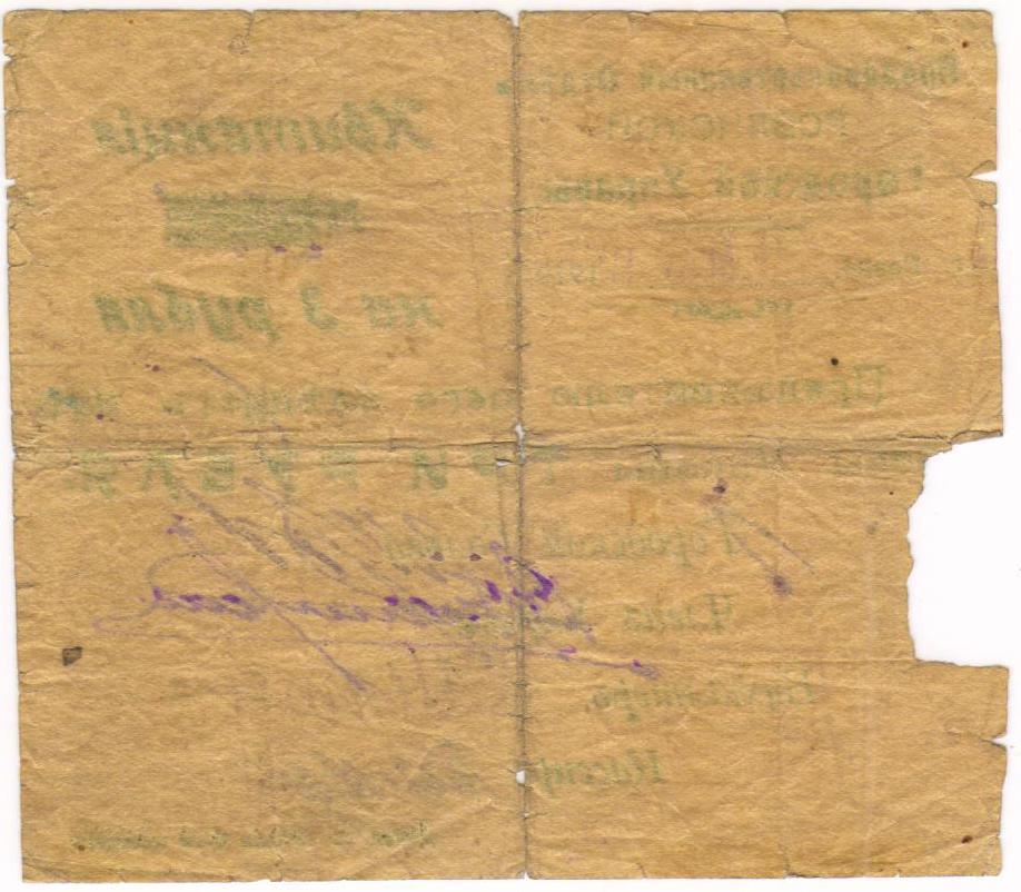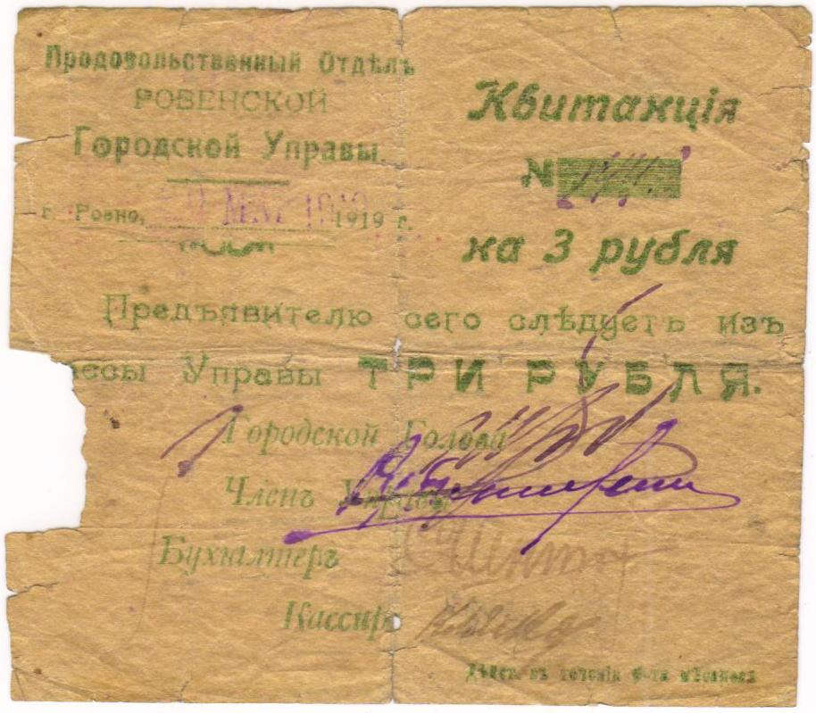 Квитанция. 3 рубля. 1919 г. Ровно. Продовольственный отдел городской управы.