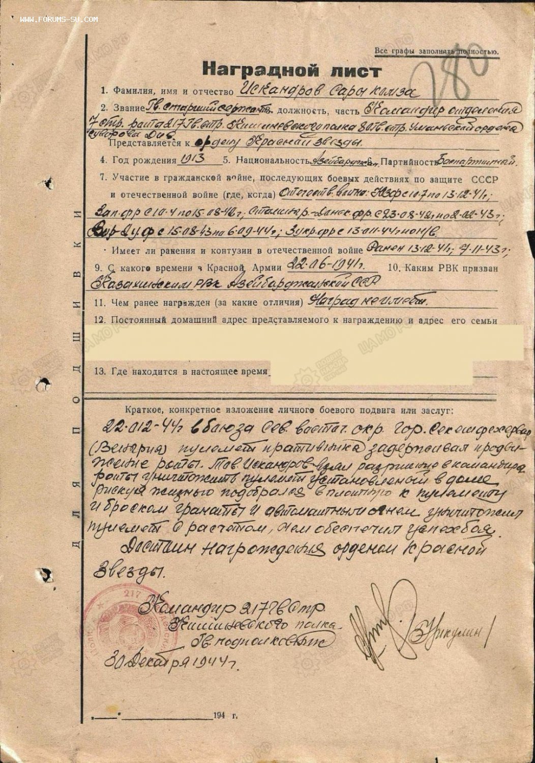 Красного Знамени, Суворова, Кутузова, Богдана Хмельницкого, Александра Невского, Ушакова, Нахимова, Отечественной Войны, Красной Звезды, Славы, За Службу Родине в ВС СССР