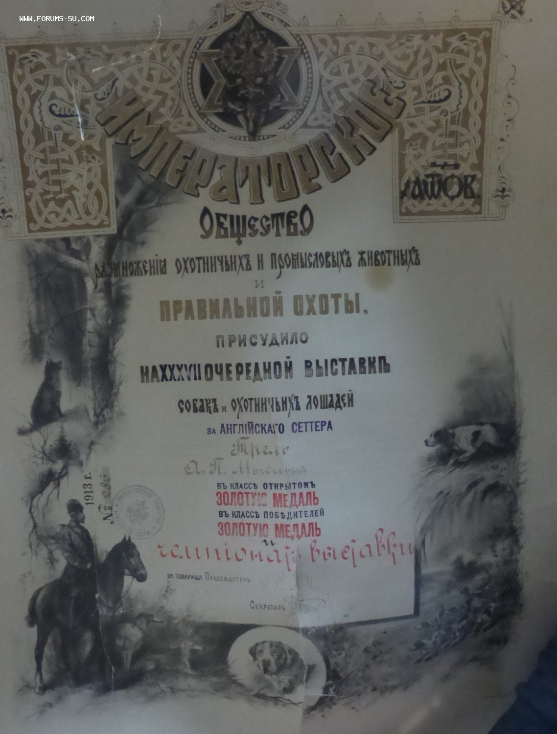1913 год, № 286. Надпись: "Императорское общество размножения охотничьих и промысловых животных и правильной охоты присудило на XХХVII очередной выставке собак и охотничьих лошадей за английскаго сеттера Трель... в классе открытом золотую медаль в классе победителей золотую медаль"