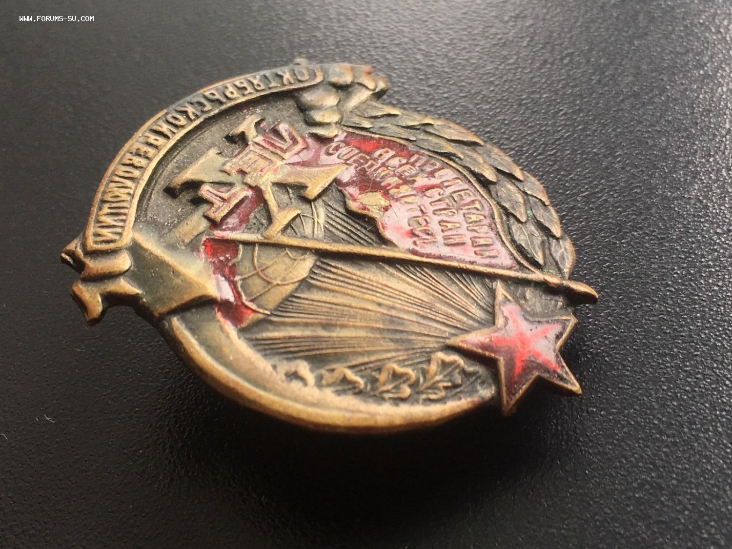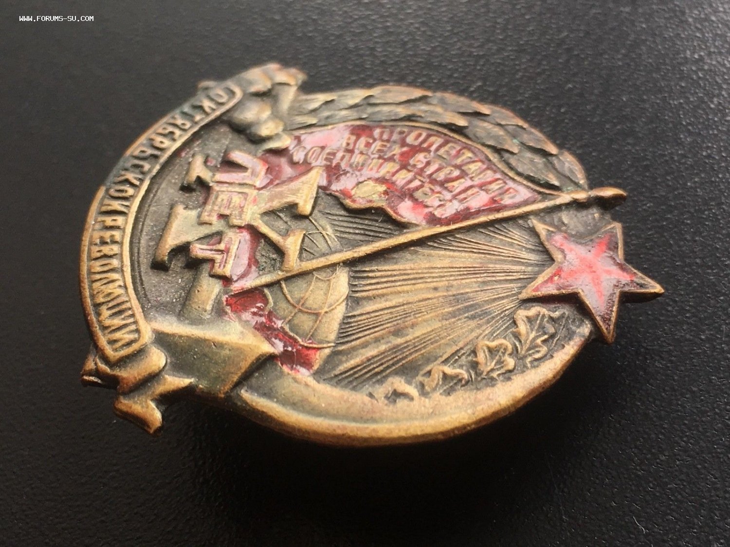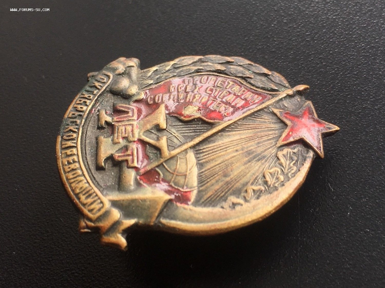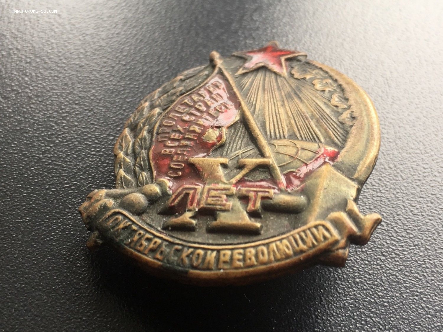 Знак 10 лет Октябрьской Революции, латунь. Состояние отличное, лишь часть красной краски отсутствует на красном знамени. Резьба винта в отличном состоянии. Гайка родная. Буду благодарен за предложения. Лот находится в Литве. Доставка по миру: 5евр. Просьба ставки также делать в долларах или евро.