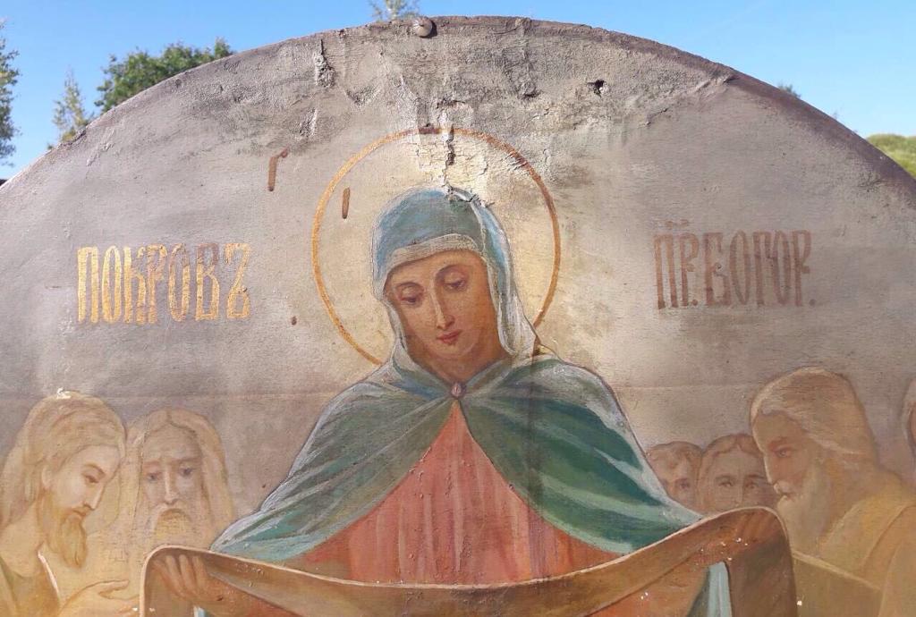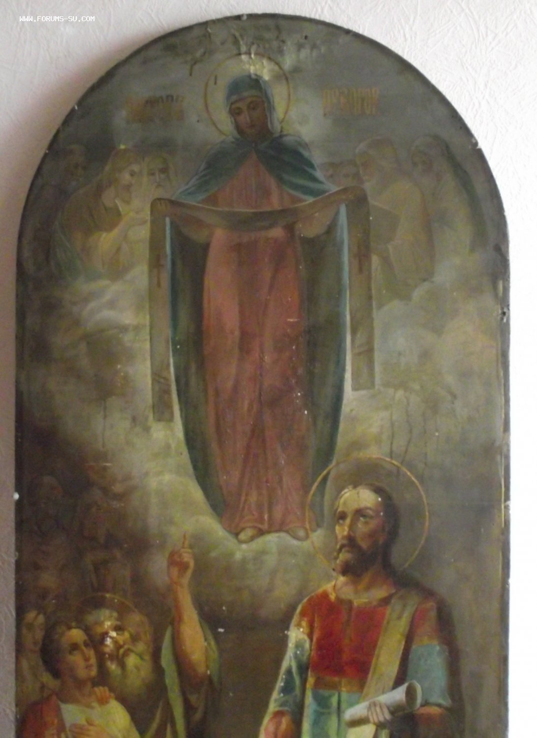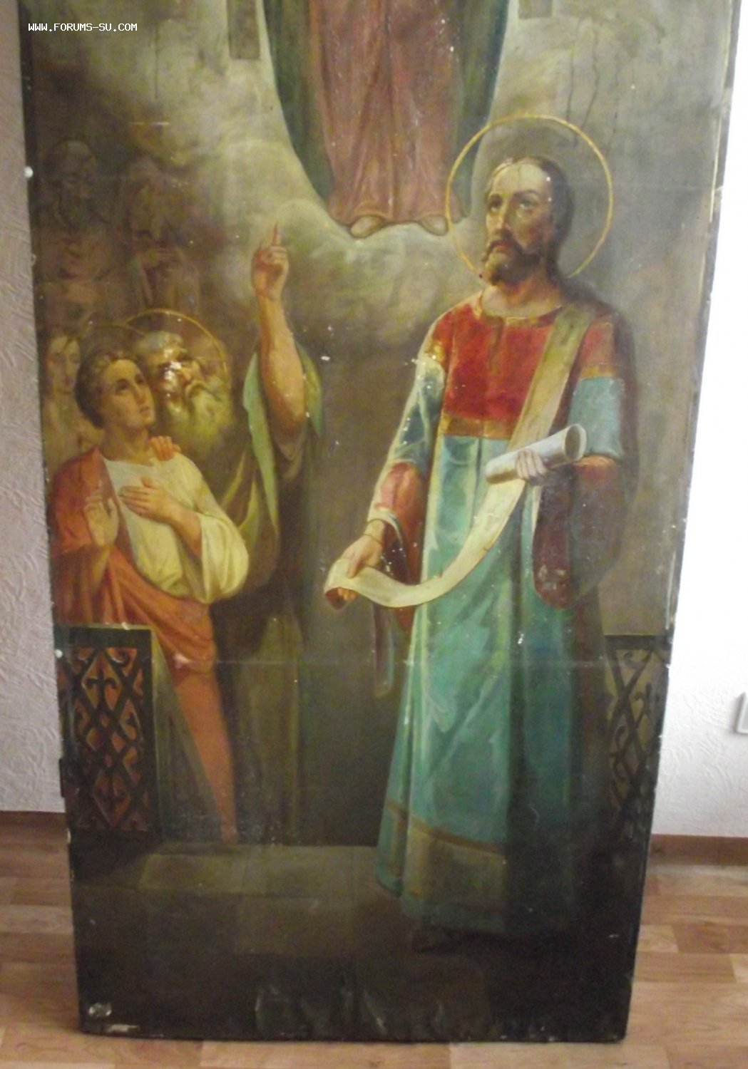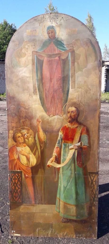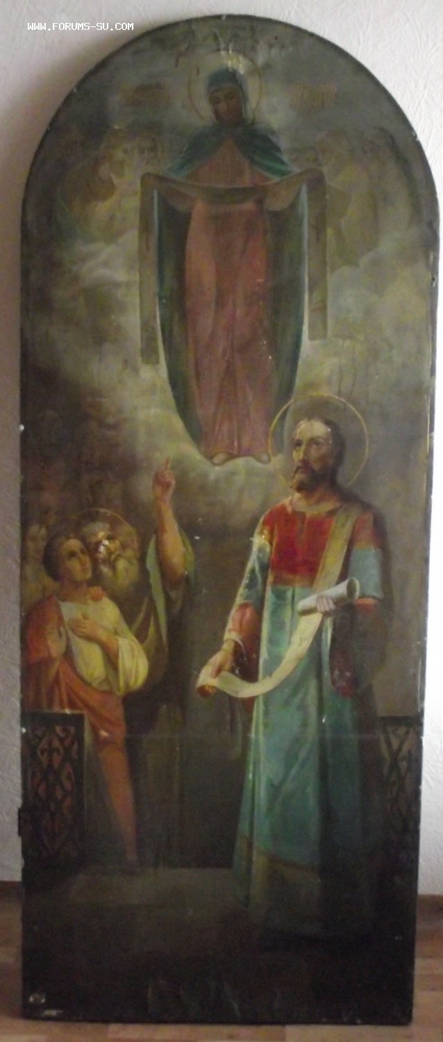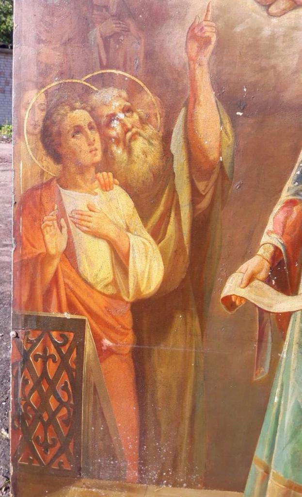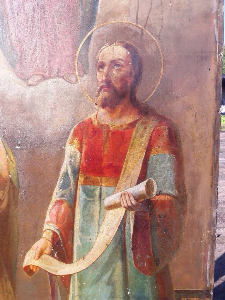 масло,конец 19 века,вес около 30кг,выполнена в академической манере, с легкими нотками модерна, уже присутствующем в верхних прозрачных фигурах святых.