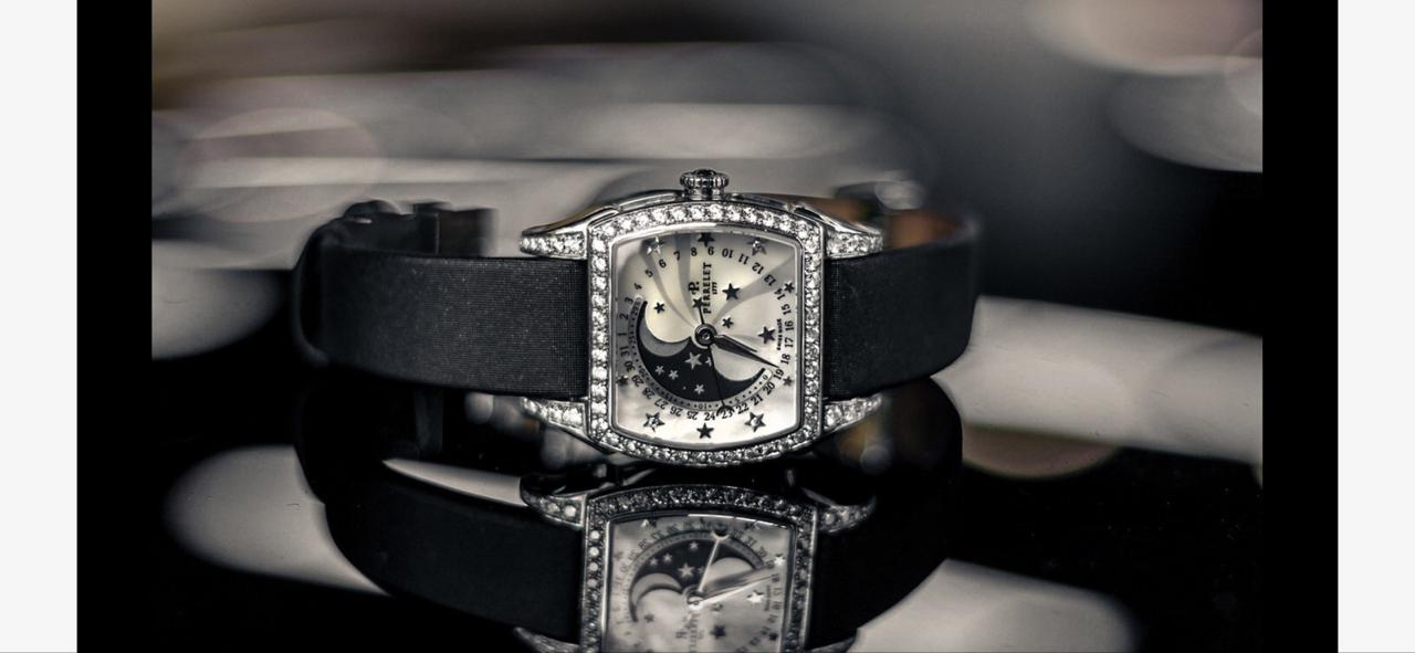 Безель и циферблат инкрустирован белыми бриллиантами