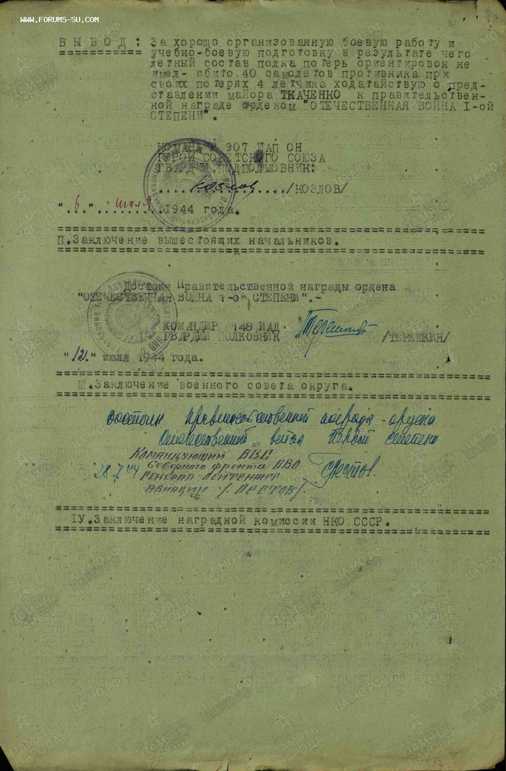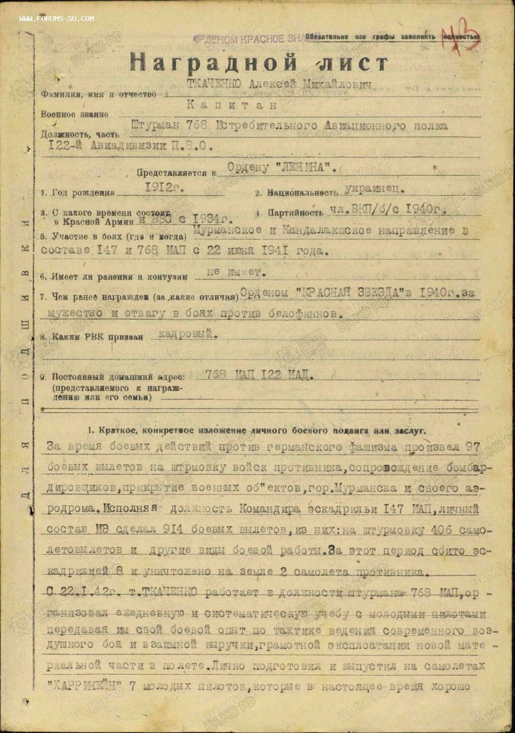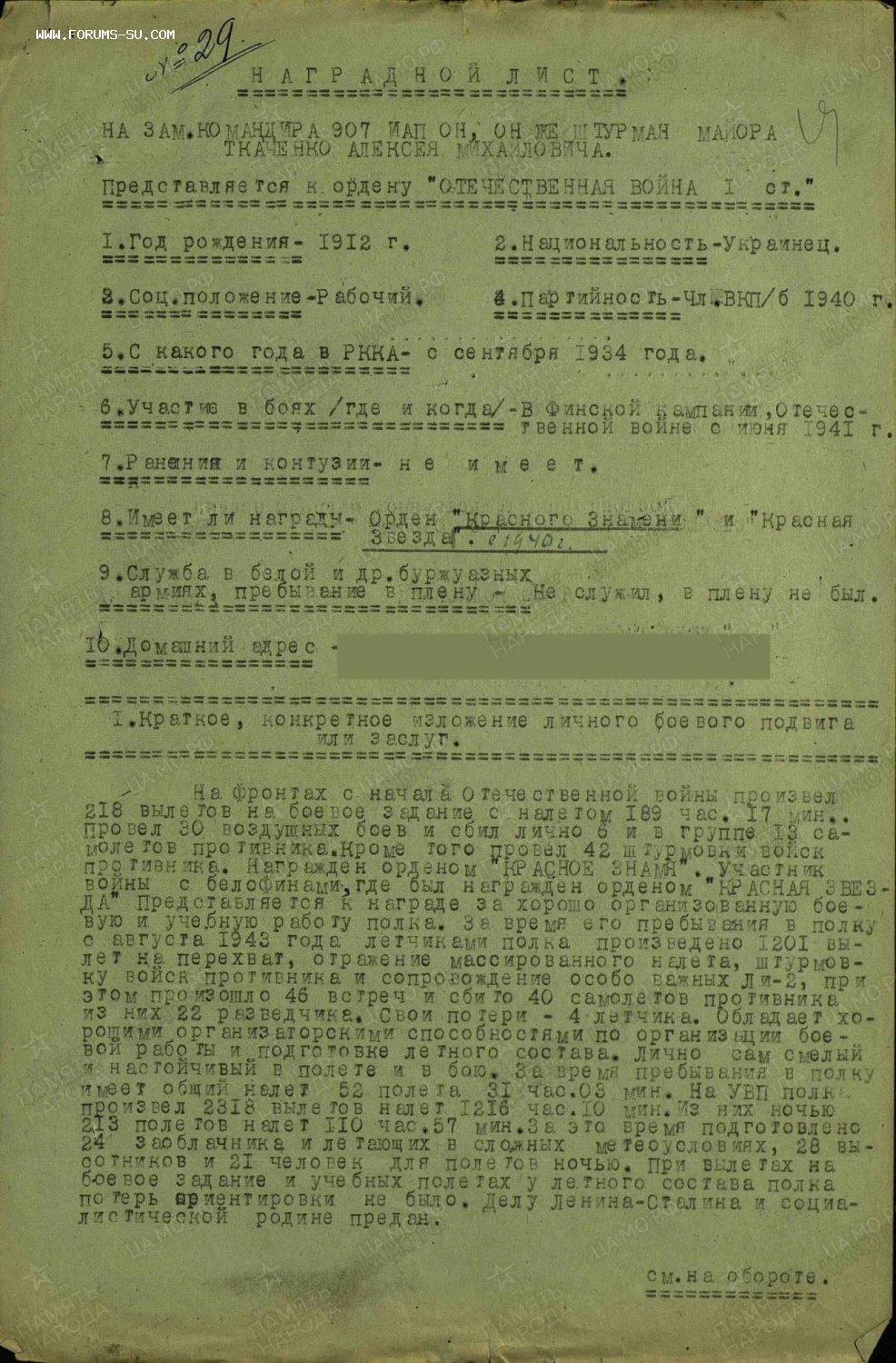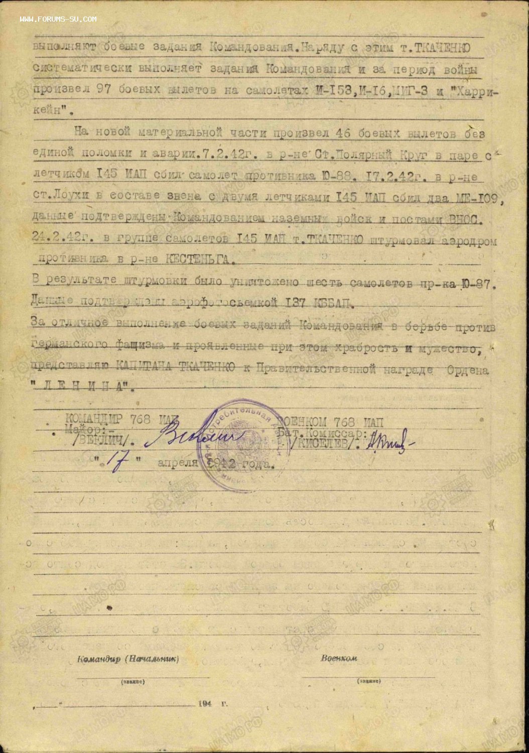 В наградном на ОВ1ст. указано,что на 6 июля 1944 года майор Ткаченко А. М. провёл 30 воздушных боёв и сбил лично 6 и в группе 13 самолётов противника. Кроме того провёл 42 штурмовки войск противника...