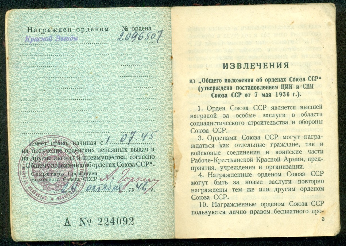Красного Знамени, Суворова, Кутузова, Богдана Хмельницкого, Александра Невского, Ушакова, Нахимова, Отечественной Войны, Красной Звезды, Славы, За Службу Родине в ВС СССР