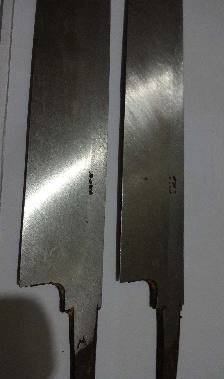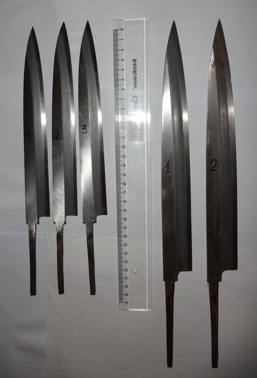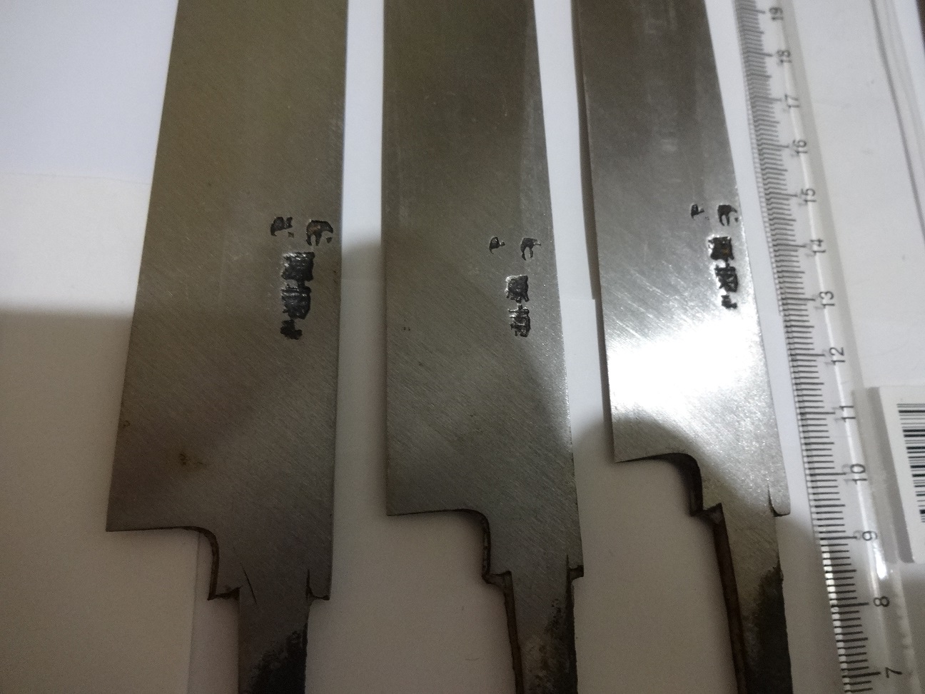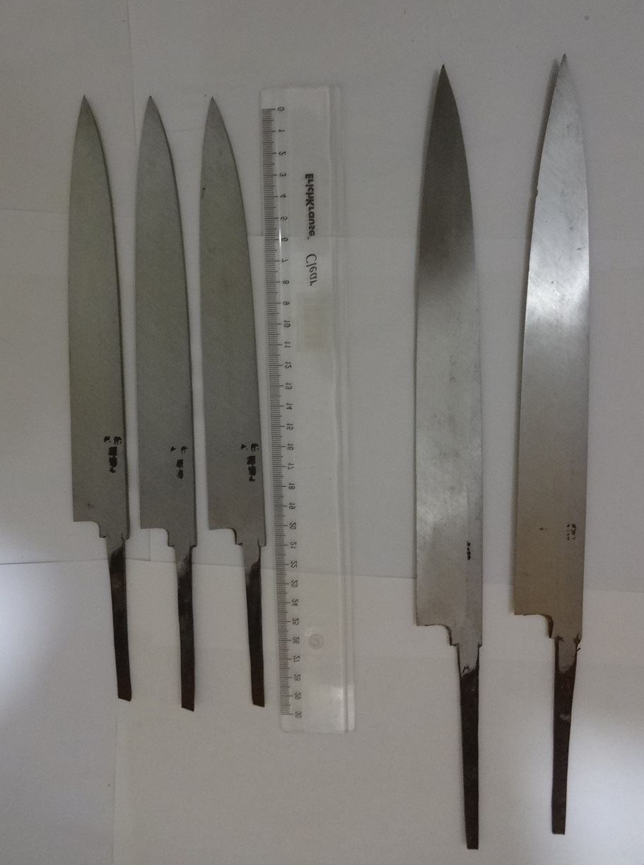 Ножи для разделки рыбы, односторонняя заточка, Япония. Не пользованные, из старых запасов. Состояние на фото, по РФ. Цена фиксированная 3 шт. средних по 3500, 2 шт. больших по 5000, почта на покупателе, за работу почты отвечаю в размере страховки, оплачиваемой по желанию покупателя и за его счет. На одном большом есть щербинки на кромке лезвия, показал на фото.