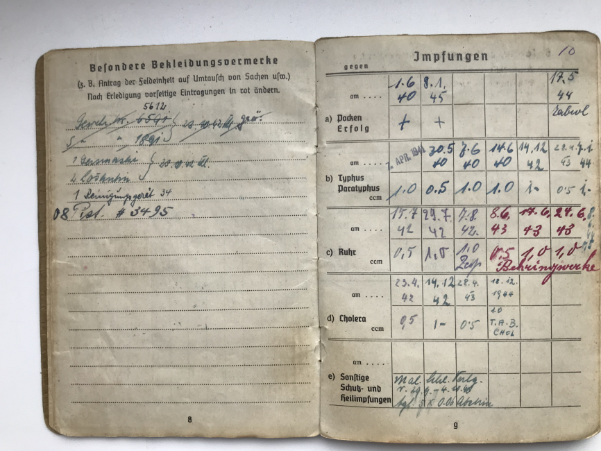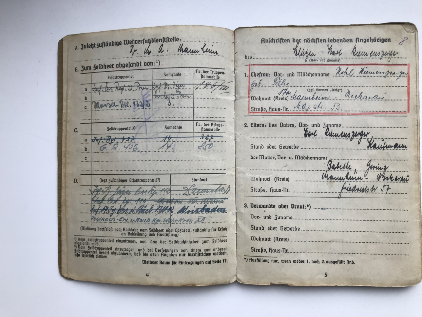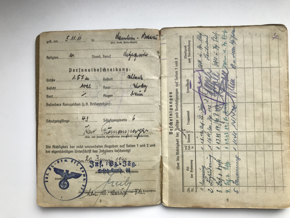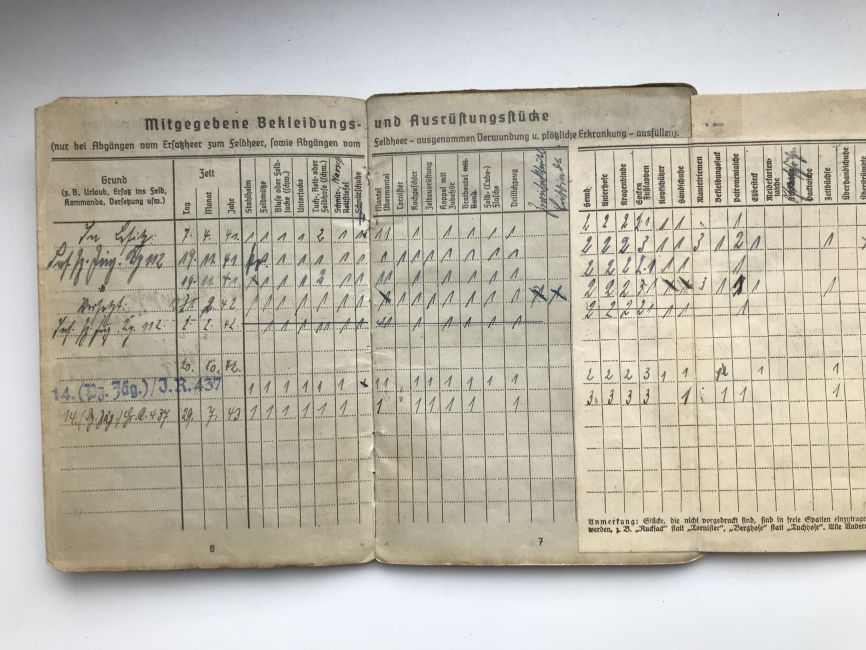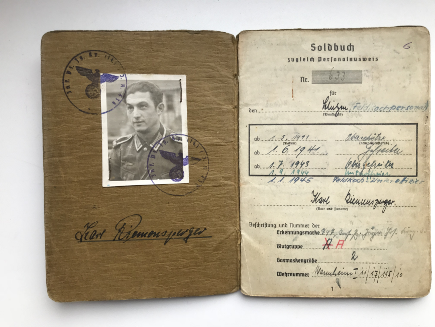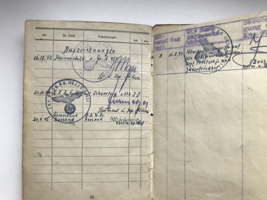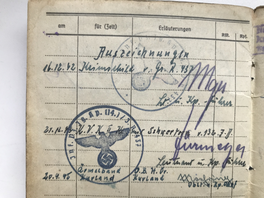 Предложу по РФ вот такой неперевыданный зольдбух на фельдфебеля 436 пех. полка 132 пех. дивизии, в хорошем сохране, все целое, всю войну в одном полку, награжден как за бои на юге (щит "Крым"), так и на севере - лента "Курляндия". плюс другая наградуха, есть вписанный штурмовой квалификационный день, за подписью ротного командира(кавалера рыцарского креста)