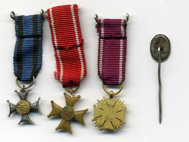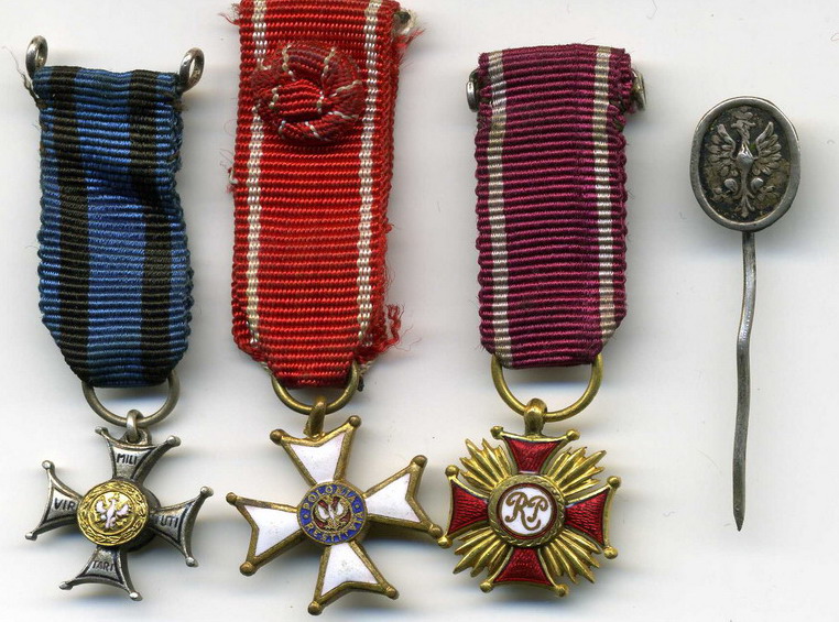 А именно : Крест Виртутти Милитари 5 кл, Полония Реститутта 4 кл (1918), Крест заслуг 1 кл (прорезной, РП). Заколка - в серебре.