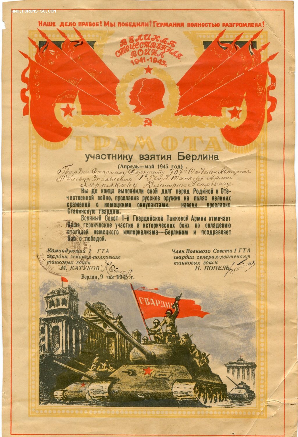 Грамота участнику взятия Берлина. Подписи: Катуков, Попель. Электрик - 16 май 2019 21:54.08 × Мини профиль пользователя Электрик Сообщения: 3199 Зарегистрирован: 07 апр 2009 19:01.13 Статус: Не в сети - 16 май 2019 21:54.08 #6335611 МПЦ 1500Добавлено B 19:20 28.05.2019:фикс 1500Добавлено B 17:50 20.06.2019:фикс 1400Добавлено B 10:59 03.08.2019:фикс 1300Добавлено B 19:30 23.08.2019:фикс 1200 Тема поднималась пользователем Электрик 16 июн 2019 20:56.25. За доставку несу ответственность только на сумму страховки.