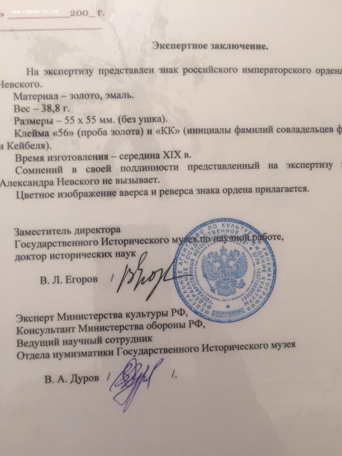 Есть эксперты, считающие подлинником. Более того. Есть заключение ГИМ, что это подлинник, с подписями экспертов - Дурова и Егорова, правда, без даты и исходящих номеров. Я не проверял, писали они это заключение или нет. Вес - 38,8 (из заключения). Золото.