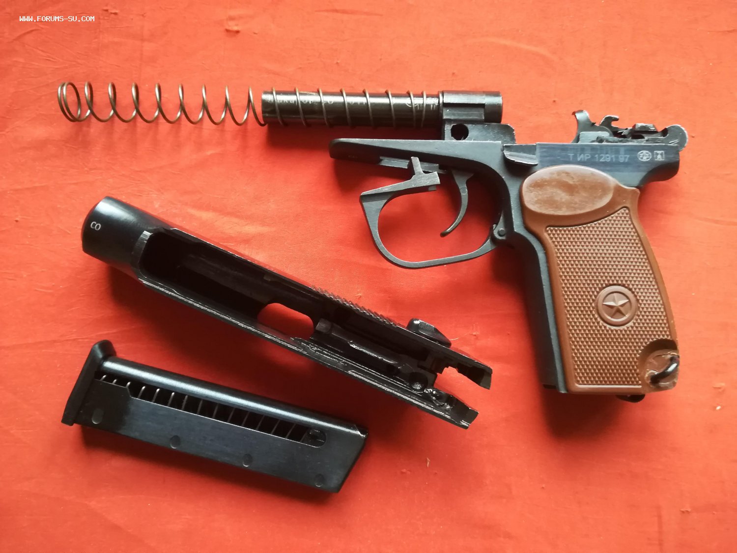 Разбирается и щелкает. Патронник под холостой патрон 10 ТК. Выход бойка заварен.
