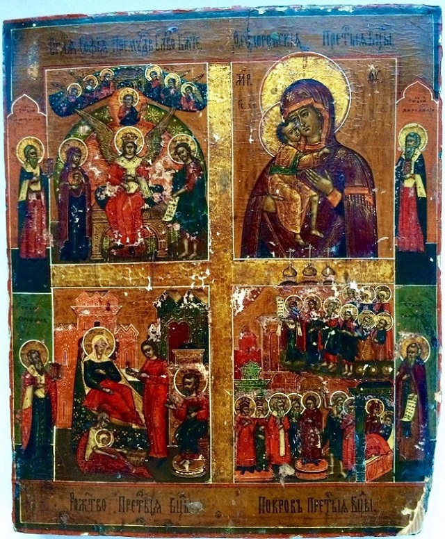 Четырехчастная икона София Премудрость Божия, Покров Богородицы, Рождество Богородицы, Феодоровская Богородица.