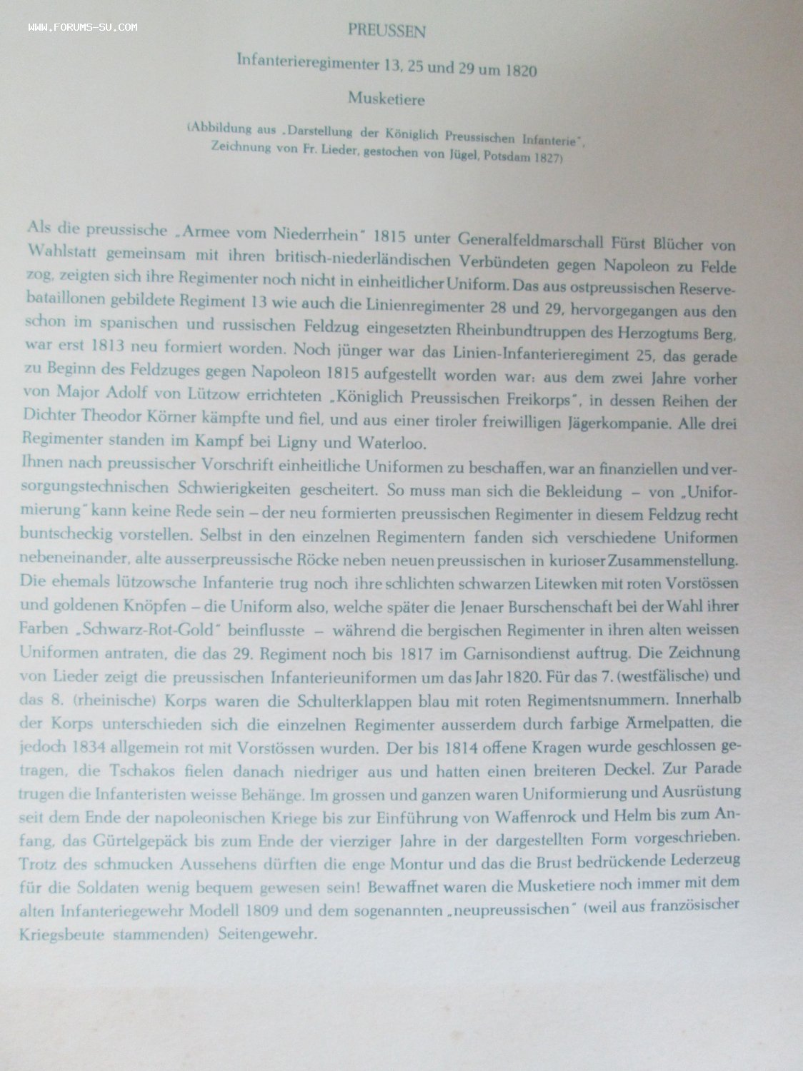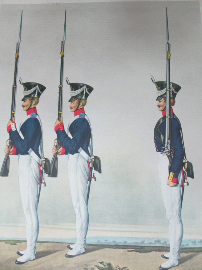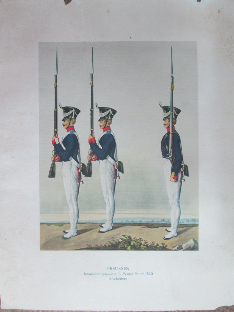 Гравюра из альбома."Darstellung der Koniglich Preussischen Infanterie" Подсдам 1827год. Состояли под командой фельдмаршала Блюхера. Гравюра на бумаге верже наклеянная на ватман с текстом.Гравюра на стали ,раскраска акварелью.Размер 43,8х33,5см. МПЦ 5000р