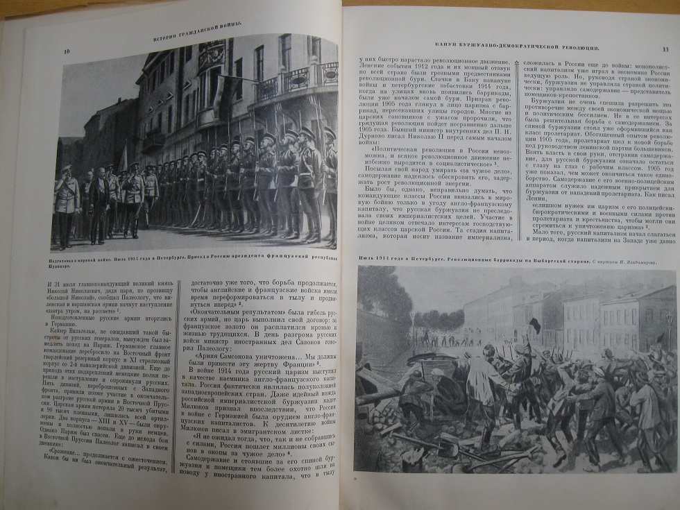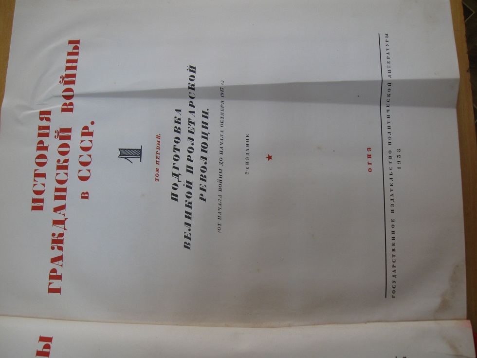 История Гражданской войны в СССР. Том первый. Подготовка Великой пролетарской революции (от начала войны до начала октября 1917 г.). 2-е издание. ОГИЗ. Москва. В родной суперобложке. Тиснение. Улучшенный жесткий переплет. Увеличенный формат: 23х30 см., 1938 год, тираж 200 тыс (51 – 100 тыс.) экз., 2-я типография ОГИЗа РСФСР треста «Полиграфкнига» «Печатный двор» имени А.М.Горького, Ленинград. 307 страниц, страницы чистые, много цветных и черно-белых напечатанных фотографий. Цветные картинки и фото на всю страницу переложены листами из кальки. Все страницы. Состояние очень хорошее. На нескольких страницах есть небольшие рыжие пятна. Цена-2200 руб.