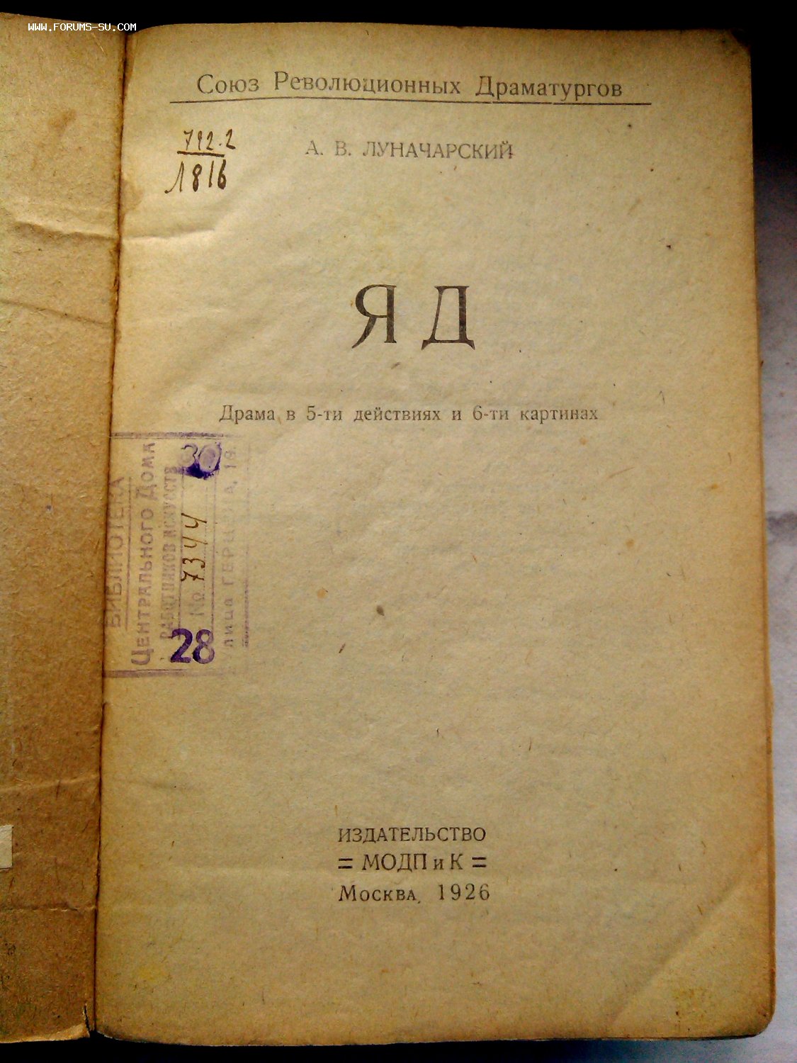 Редчайшее издание пьесы "ЯД" А.В.Луначарского. Оригинальный картонажный переплет издательства "МОДП и К" .Лицевая крышка оформлена в конструктивистском стиле,что характерно для того времени.Печати и пометки инвентарные библиотеки Центрального Дома работников искусств,видимо,довоенные еще! Из недостатков - отсутствует лист в развороте ( на фото показал ) стр.39-42.