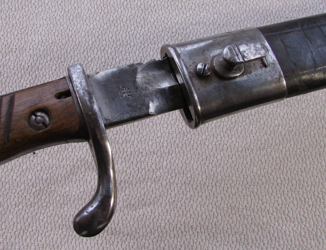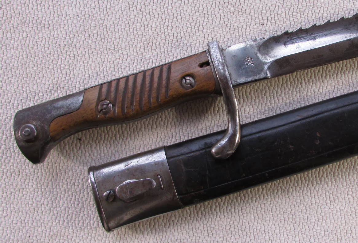На клине двойное клеймение, на обеих сторонах. Ножны кожа, все крепко и цело. Клин входит до конца, без зазора