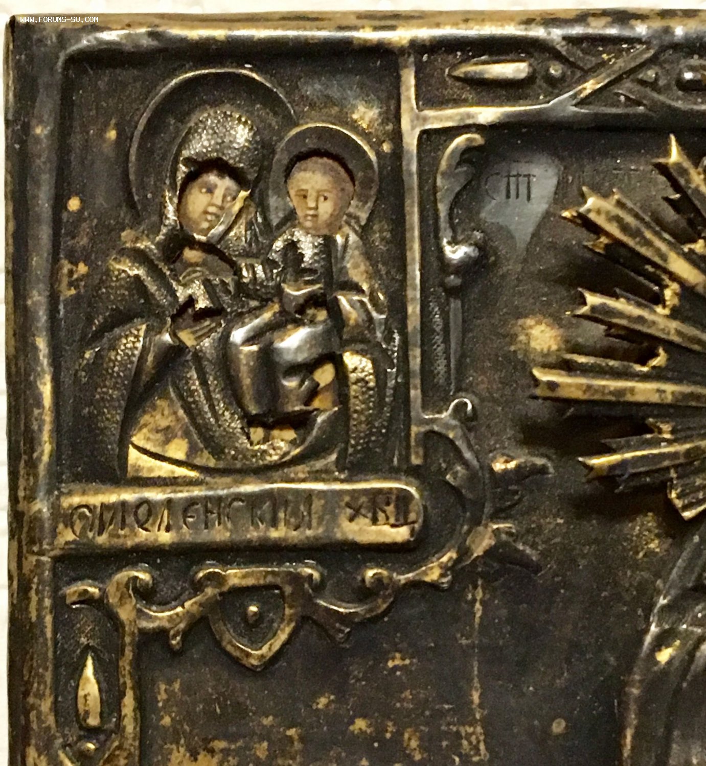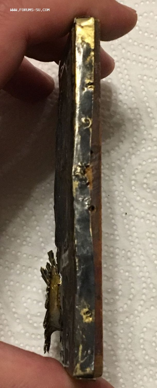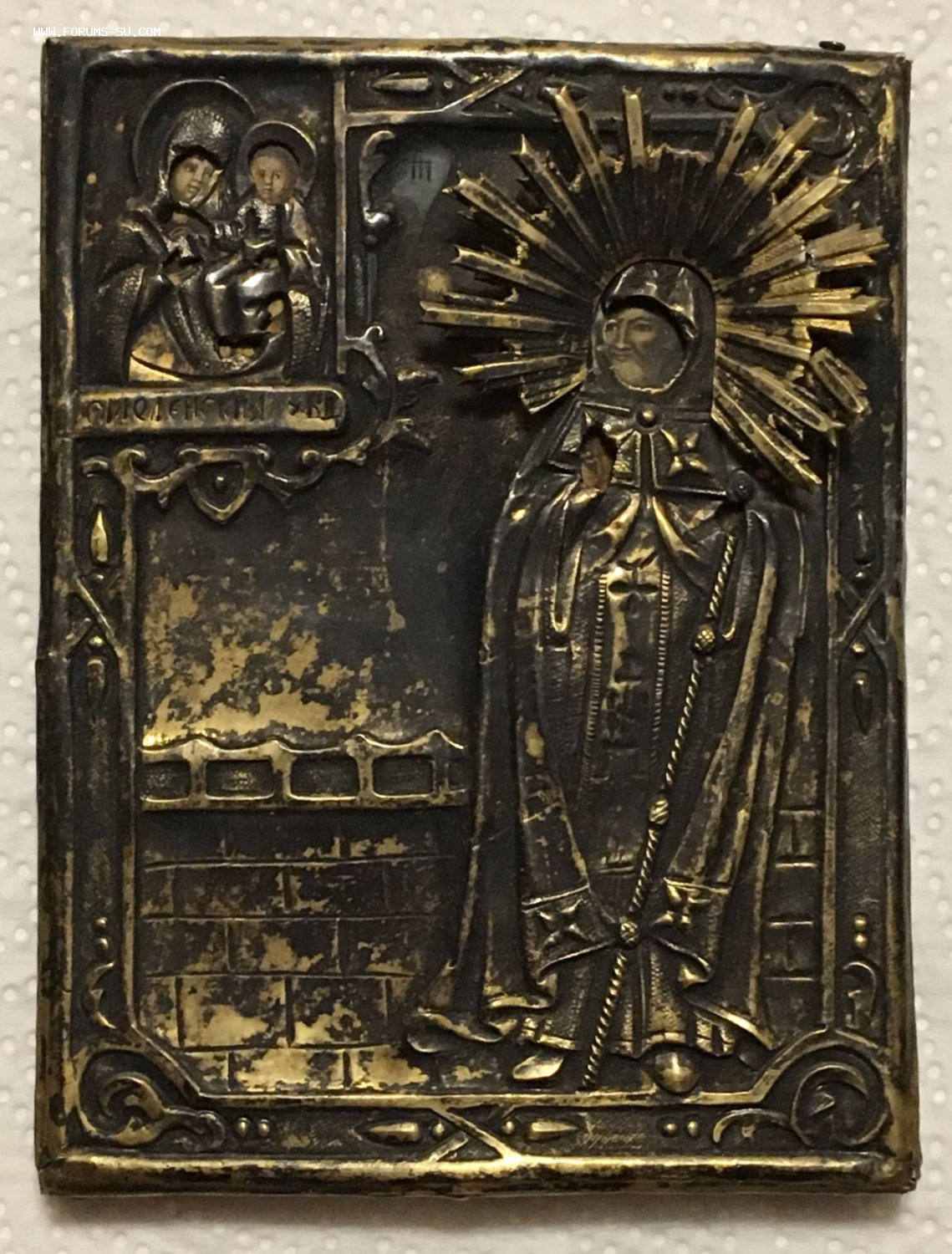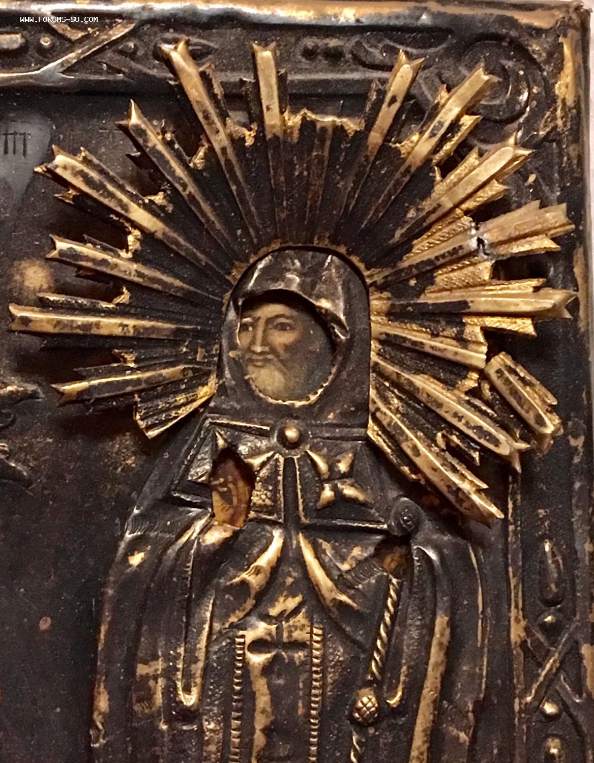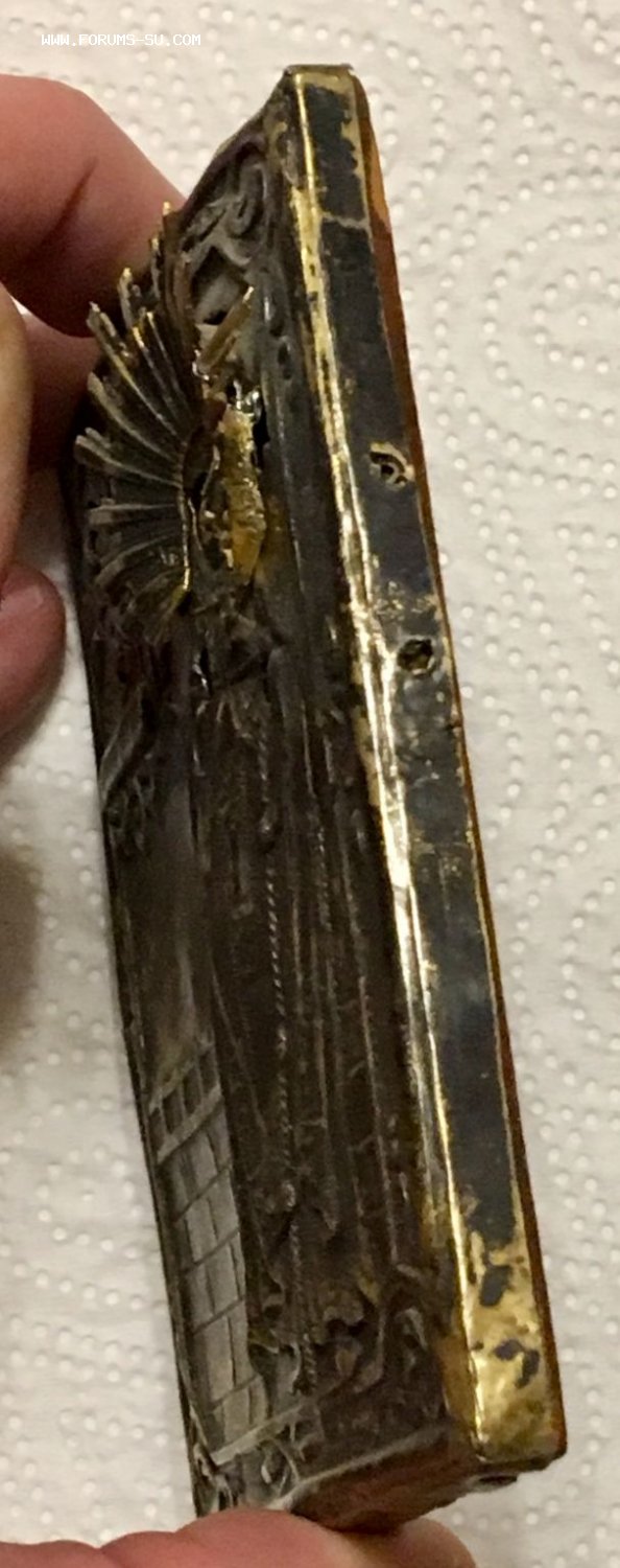 Икона с редким сюжетом. Кованый и очень рельефный оклад, серебро 84 пробы. Точные размеры иконы 11,5 х 8,5 см. Пожизненная гарантия подлинности. На венчике Митрофана два лучика с трещиной (на фото показал крупно фрагмент венца Митрофана).