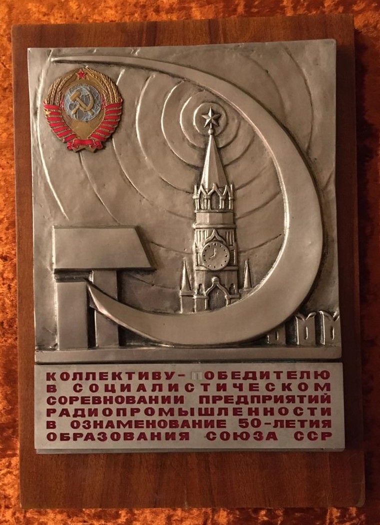 Табличка наградная Радиопромышленность (Радио). Коллективу-победителю в социалистическом соревновании предприятий радиопромышленности в ознаменование 50-летия образования Союза ССР. Размер 33х24 см. Увесистая. Встречается крайне редко. Оригинал.