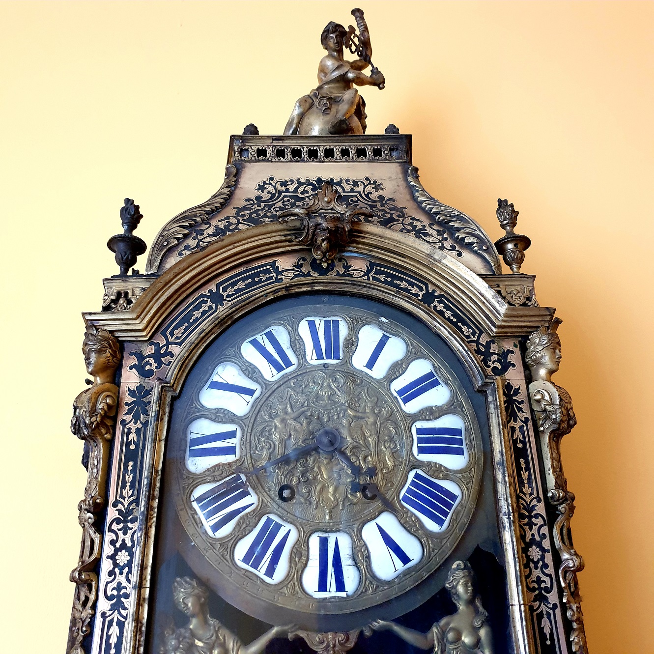 Часы Буль, XVIII /XIX век. Черная черепаха. Высота с консолью:110 см. Предмет еще не реставрирован. Цена после реставрации (включая золочение бронзы и доставку в Москву ) 360000 p.