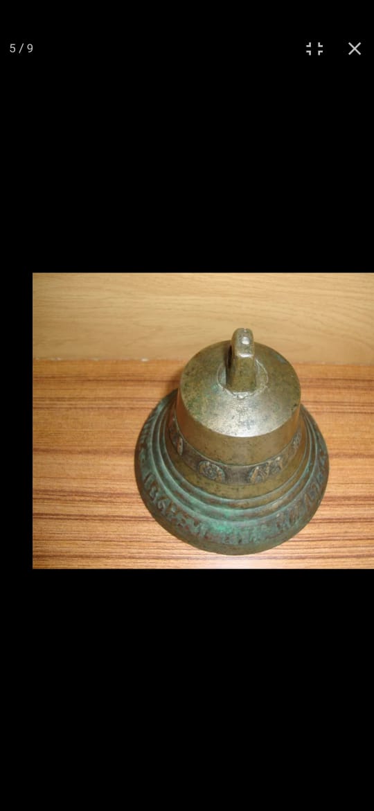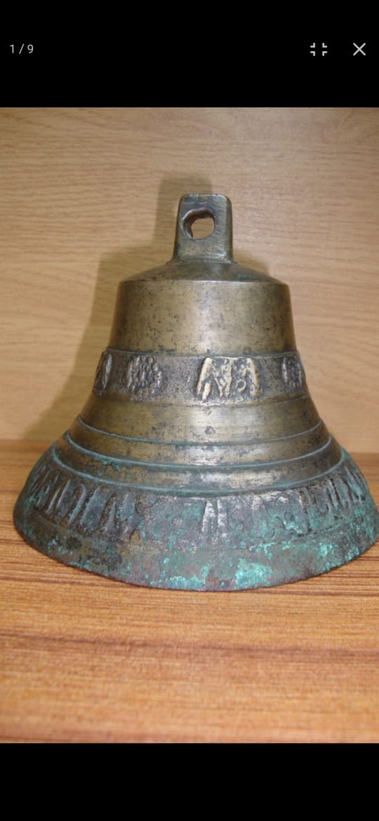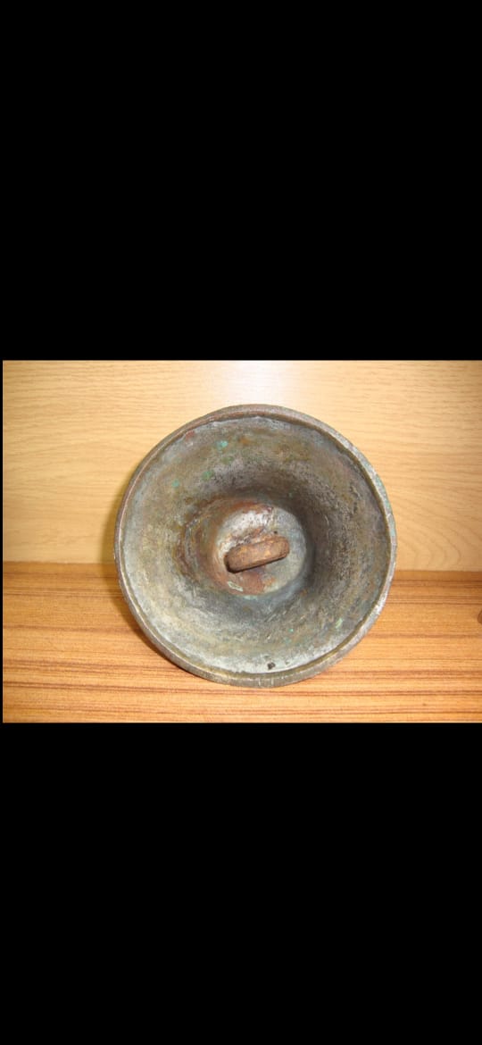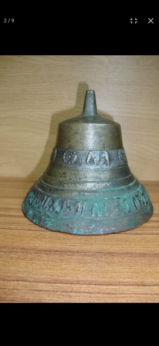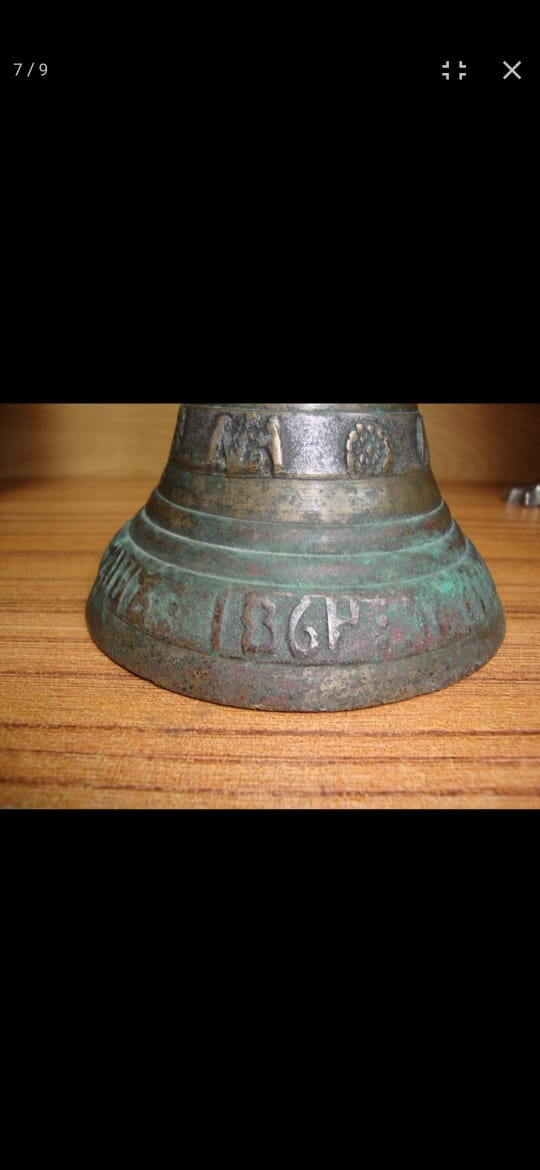Вологодский колокол. 1864 год. Мастер: Голчин. Высота 11 см. Диаметр 13 см. Надпись на юбке: "1864 го сей ко лилъ Ма Михайло Голчин". Масса - 960 грамм. Цифра "4" в дате перевёрнута. С густой патиной, очень звонкий.