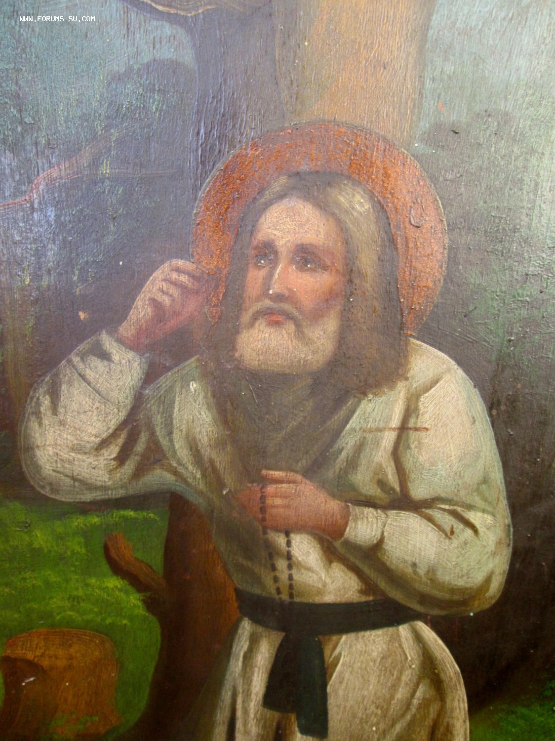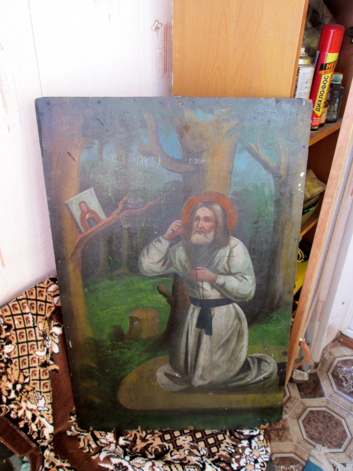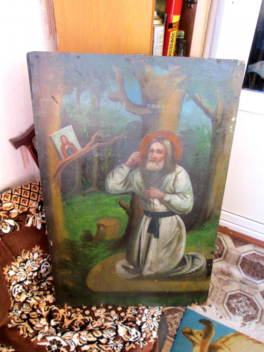 В продаже Храмовый Образ Серафим Саровский в молении на камне. Живопись нач 20 века, без вмешательств и реставрации. Икона написана на тонкой доске, типа фанеры, плюс рама.